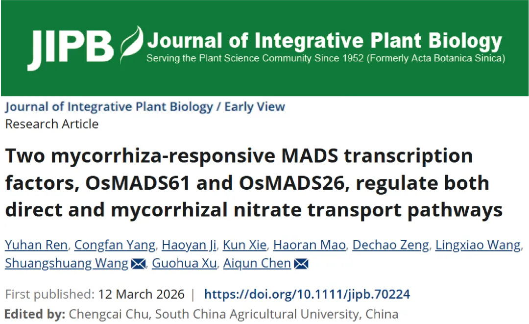 图1 OsMADS61/26协同调控直接途径与菌根途径硝酸盐吸收南京农业大学已毕业博士、现任齐鲁师范学院生命科学学院讲师任雨涵和博士生杨聪帆为该论文的共同第一作者,南京农业大学陈爱群教授和南京农业大学已出站博士后、现任中国热带农业科学院热带生物技术研究所王双双青年研究员为共同通讯作者。该研究得到了国家重点研发计划、国家自然科学基金等项目的资助。Ren, Y., Yang, C., Ji, H., Xie, K., Mao, H., Zeng, D., Wang, L., Wang, S., Xu, G., Chen, A. (2026). Two mycorrhiza-responsive MADS transcription factors, OsMADS61 and OsMADS26, regulate both direct and mycorrhizal nitrate transport pathways. J. Integr. Plant Biol.https://doi.org/10.1111/jipb.70224