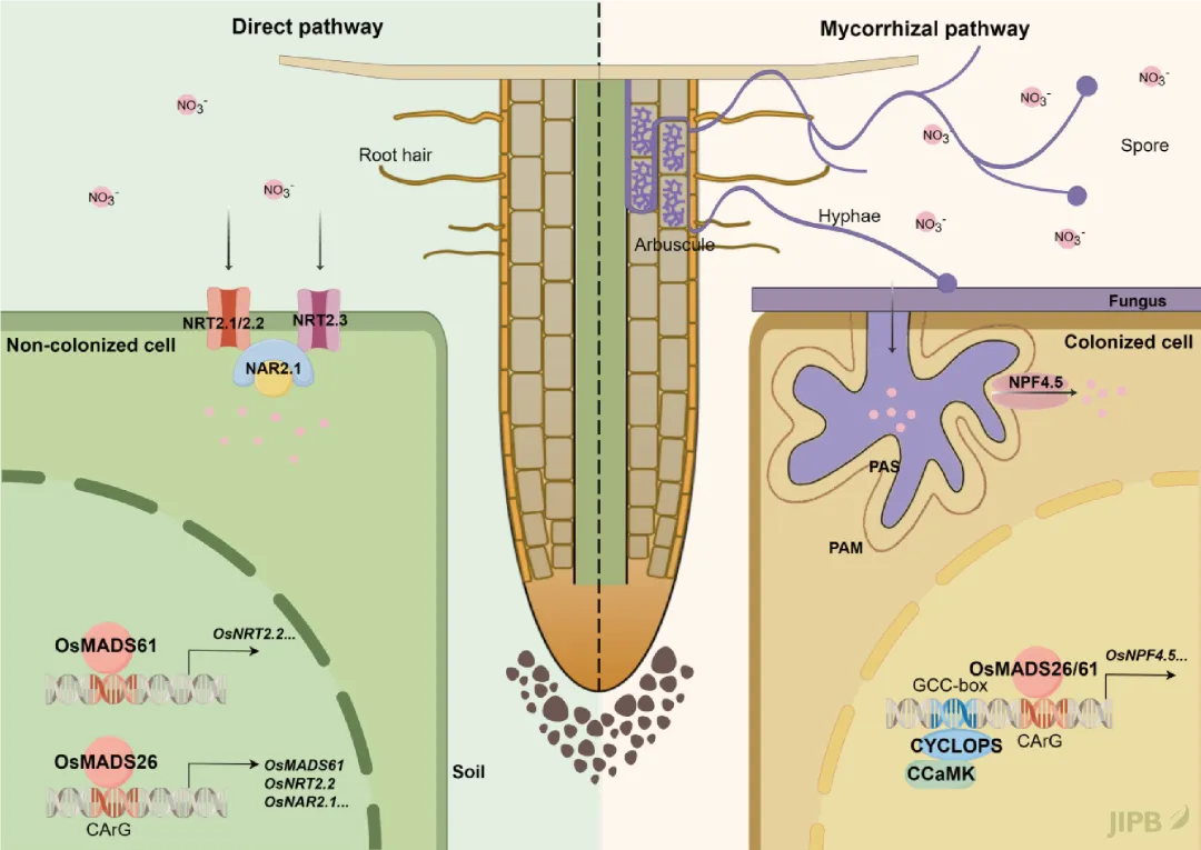 近日, 南京农业大学资源与环境科学学院徐国华/陈爱群课题组在JIPB上发表题为"Two mycorrhiza-responsive MADS transcription factors, OsMADS61 and OsMADS26, regulate both direct and mycorrhizal nitrate transport pathways"的研究论文 (https://doi.org/10.1111/jipb.70224)。该研究揭示了两个菌根诱导的MADS-box转录因子OsMADS61和OsMADS26, 通过识别关键顺式元件CArG-box, 协同调控水稻硝态氮吸收直接途径与菌根途径的新机制。