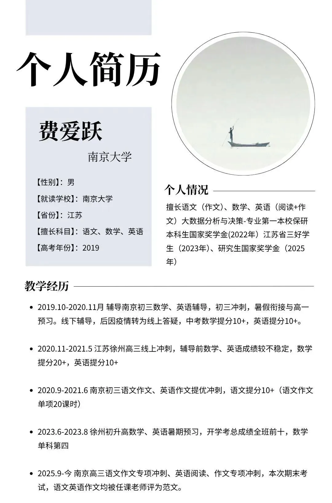 南京大学研究生,擅长数学、语文作为,英语阅读+作文,七年教龄