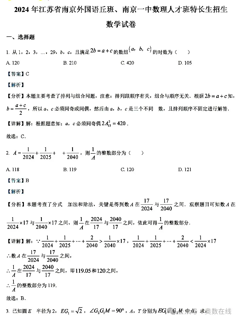 >2024江苏省南京外国语丘班+南京一中数理人才班特长生招生试题+答案解析(2024)