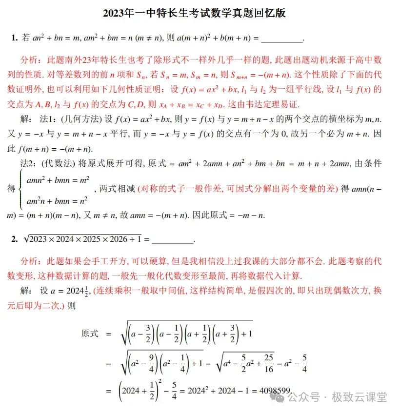 2024江苏省南京外国语丘班+南京一中数理人才班特长生招生试题+答案解析(2024)