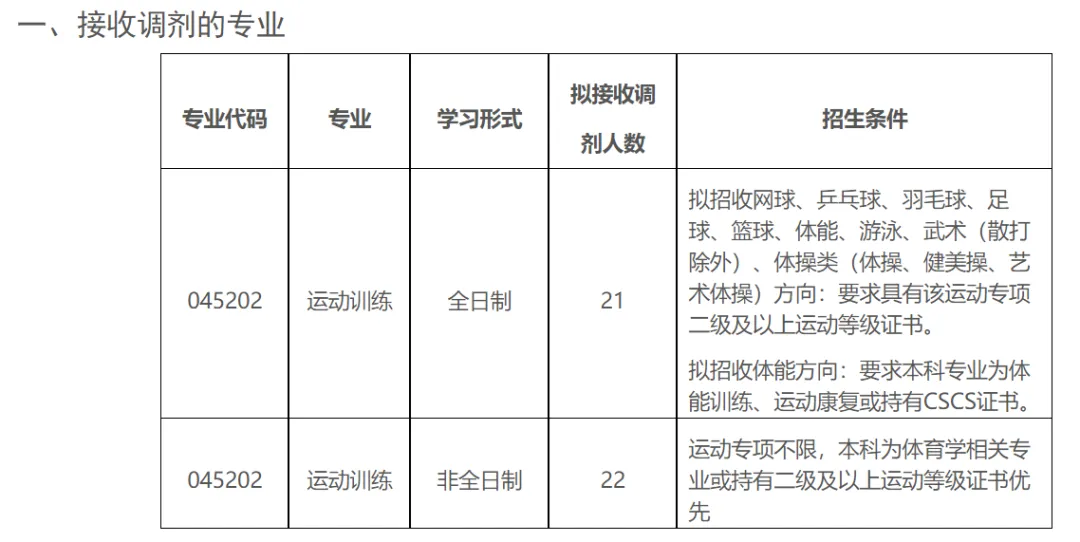 去年具体调剂要求如下图,需要运动等级,及限定运动项目。运动训练-非全周末或节假日上课。