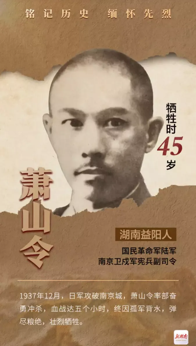在发现无力回天后,萧山令冲杀5个小时,将最后一颗子弹留给了自己,当时,萧山令担任宪兵副司令、代理首都警察厅长、战时南京市长、代理南京警备司令、防空司令、渡江指挥。