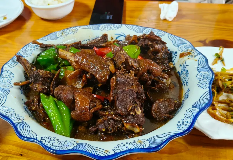 老鹅一般是先焯后卤,卤水里会放八角、桂皮、葱姜,火不用猛,慢慢咕嘟。端上桌时皮是棕亮的,手一撕就能看见纤维,肉不算软烂,但有咬头。吃法别急,先蘸一点点盐和辣椒,或者来口蒜泥,再喝两口热汤,把山里那股潮气压下去,人就舒服了。