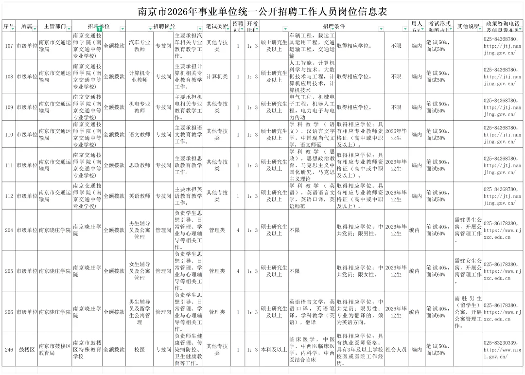 主管部门政策咨询:联系电话请见《南京市2026年事业单位统一公开招聘主管部门咨询电话表》(附件2);