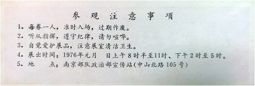 该展览于1976年元旦在南京部队政治部宣传站(今南京军人俱乐部)展出,门票设计简洁,中间“南京路上好八连”事迹展览11个大字,疑似毛体字集锦,底色大红,寓意着红色基因代代传、“南京路上好八连”是永不褪色的旗帜。该票没有副券痕迹,应是没有印制,论证属于全品,估计本市持有的是个位数,属于专题展览票和革命题材的珍品。(个人看法)