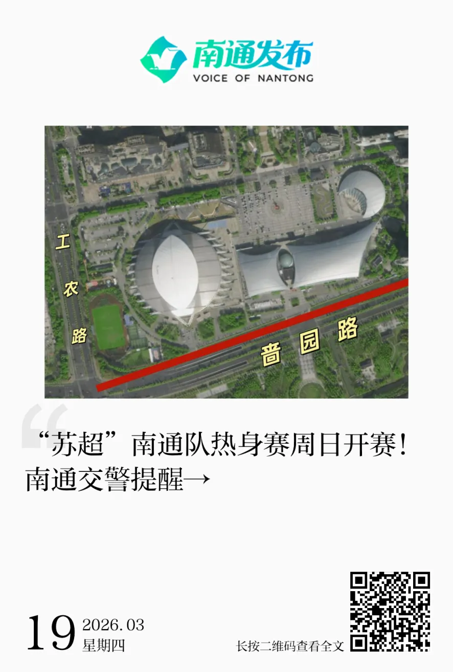 2026江苏省城市足球联赛南通队热身赛将于3月22日15:00在南通体育会展中心举行。记者昨天从市公安局交管支队获悉,为确保活动顺利进行,届时南通体育会展中心周边部分路段、区域将实行临时交通管制。