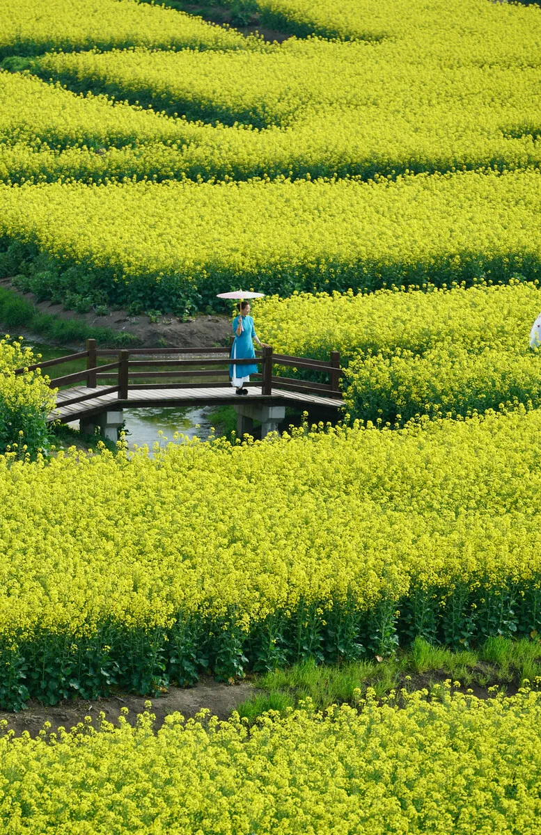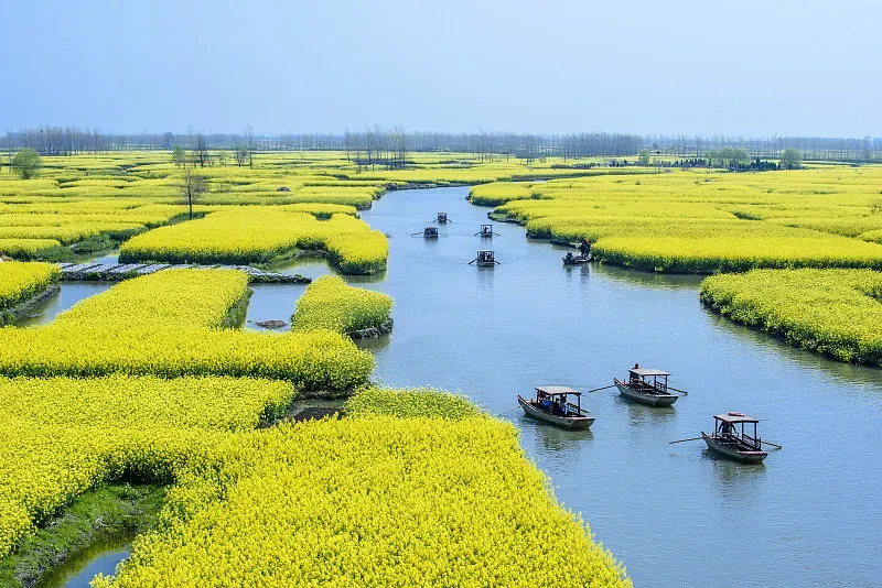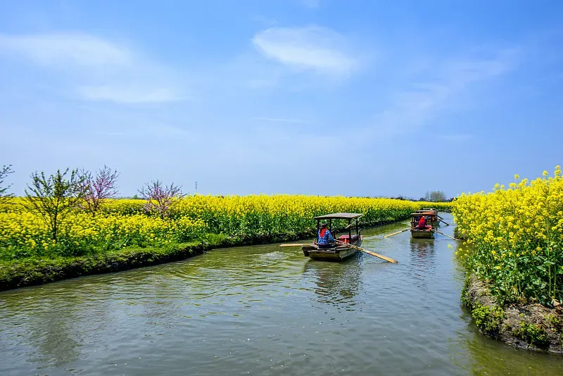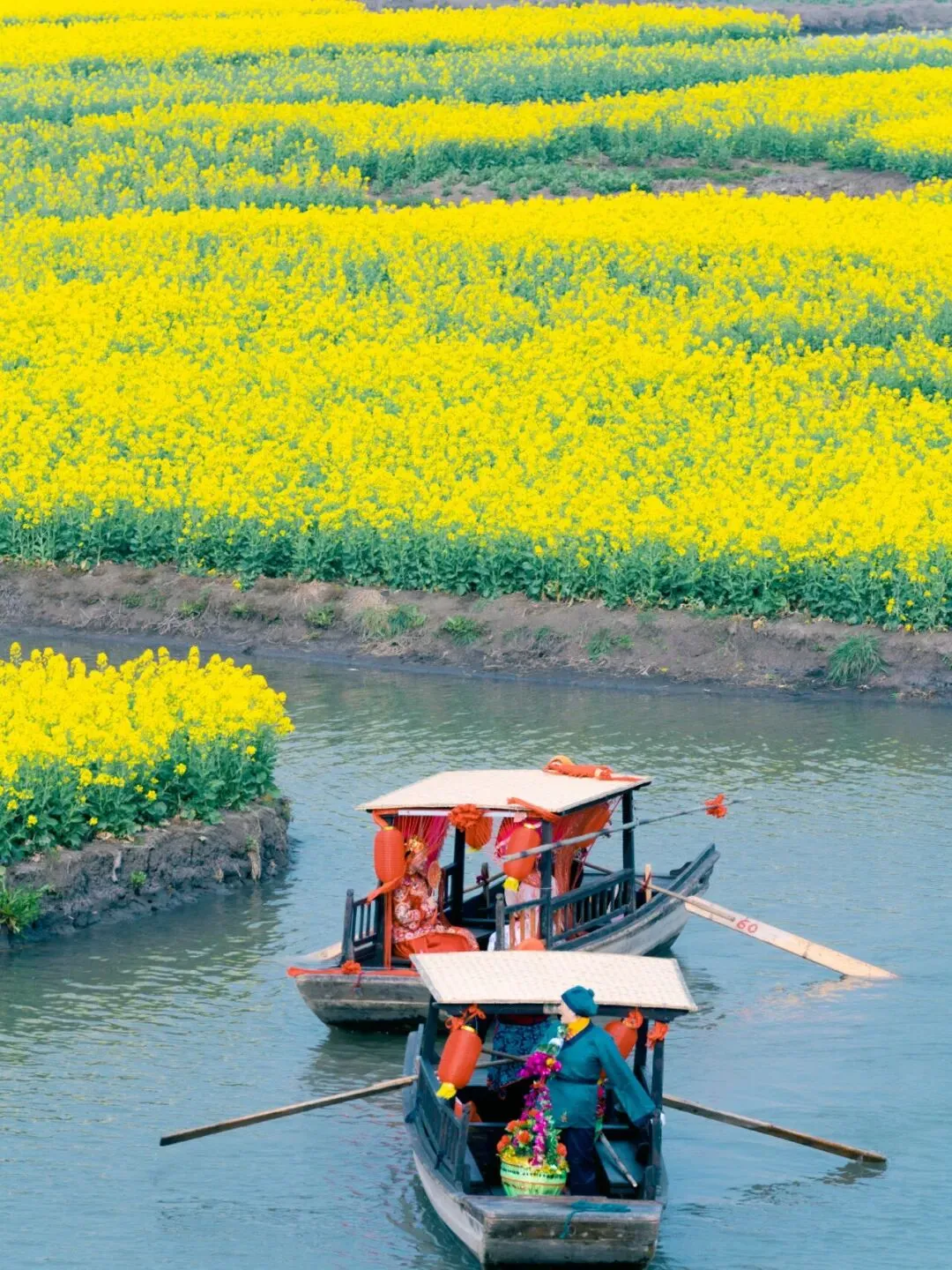 坐上三尺宽的小木船,泛舟赏花,一边感受杨柳风,一面听着船夫摇橹的咿呀声,水乡的柔情与花海的震撼,真心让人醉了。