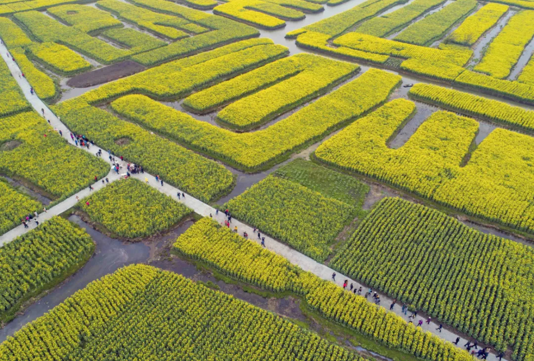 从高处俯瞰,千姿百态的垛田形成了上千个湖中小岛,岛上开满了金灿灿的油菜花。