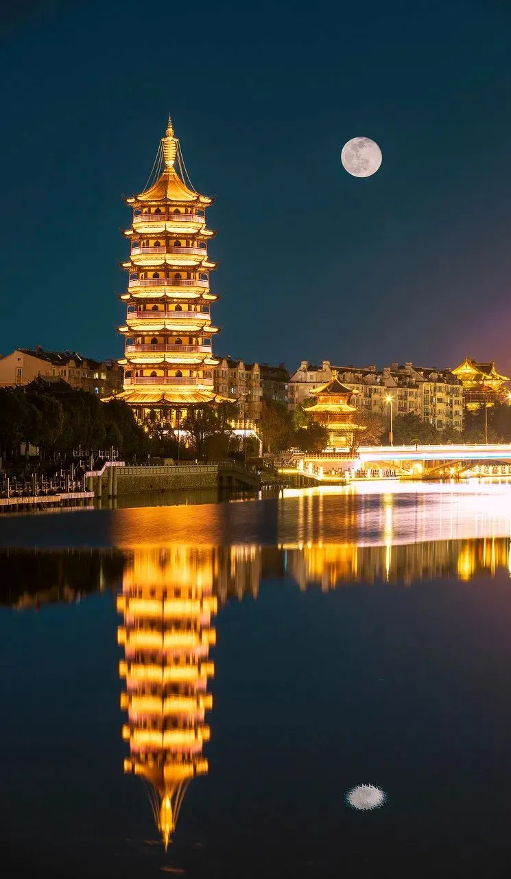 小桥流水,灯火通明,夜色里的古镇水乡,静谧而温柔。