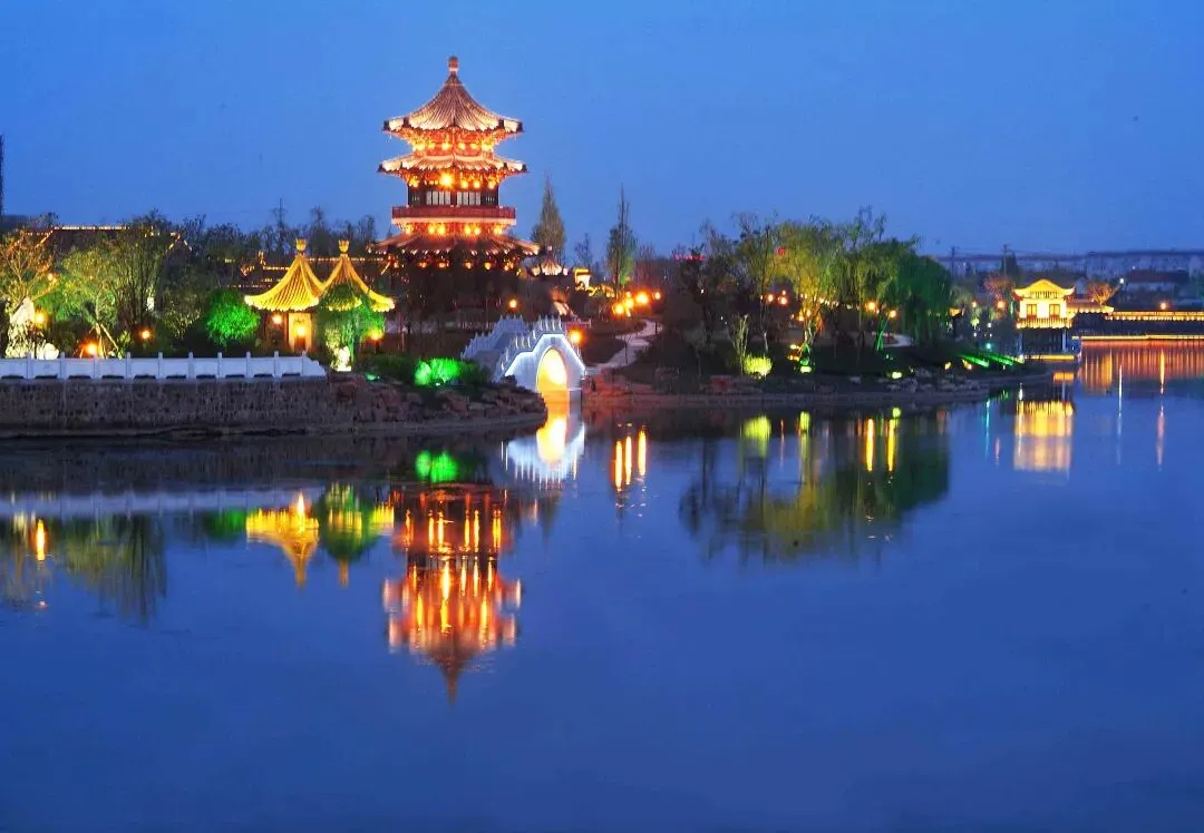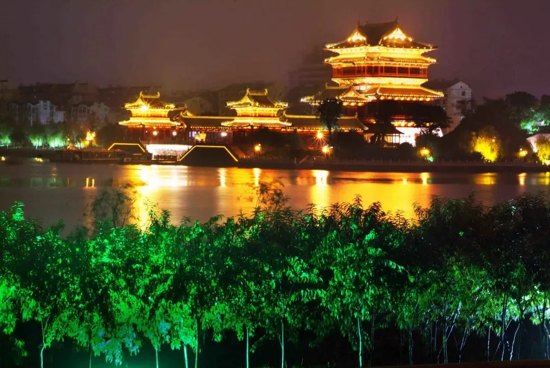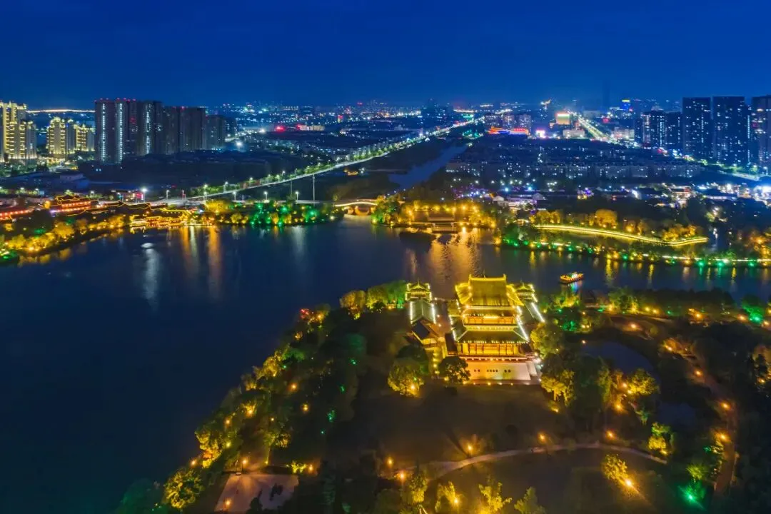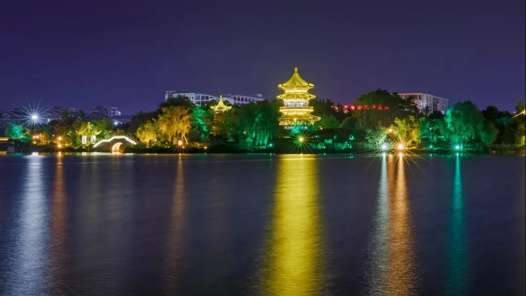 泰州古代也属于扬州,华灯初上,千年凤城河上的灯光亮起。河上的璀璨光影与水中倒影相衬,带来一场精彩的灯光秀。