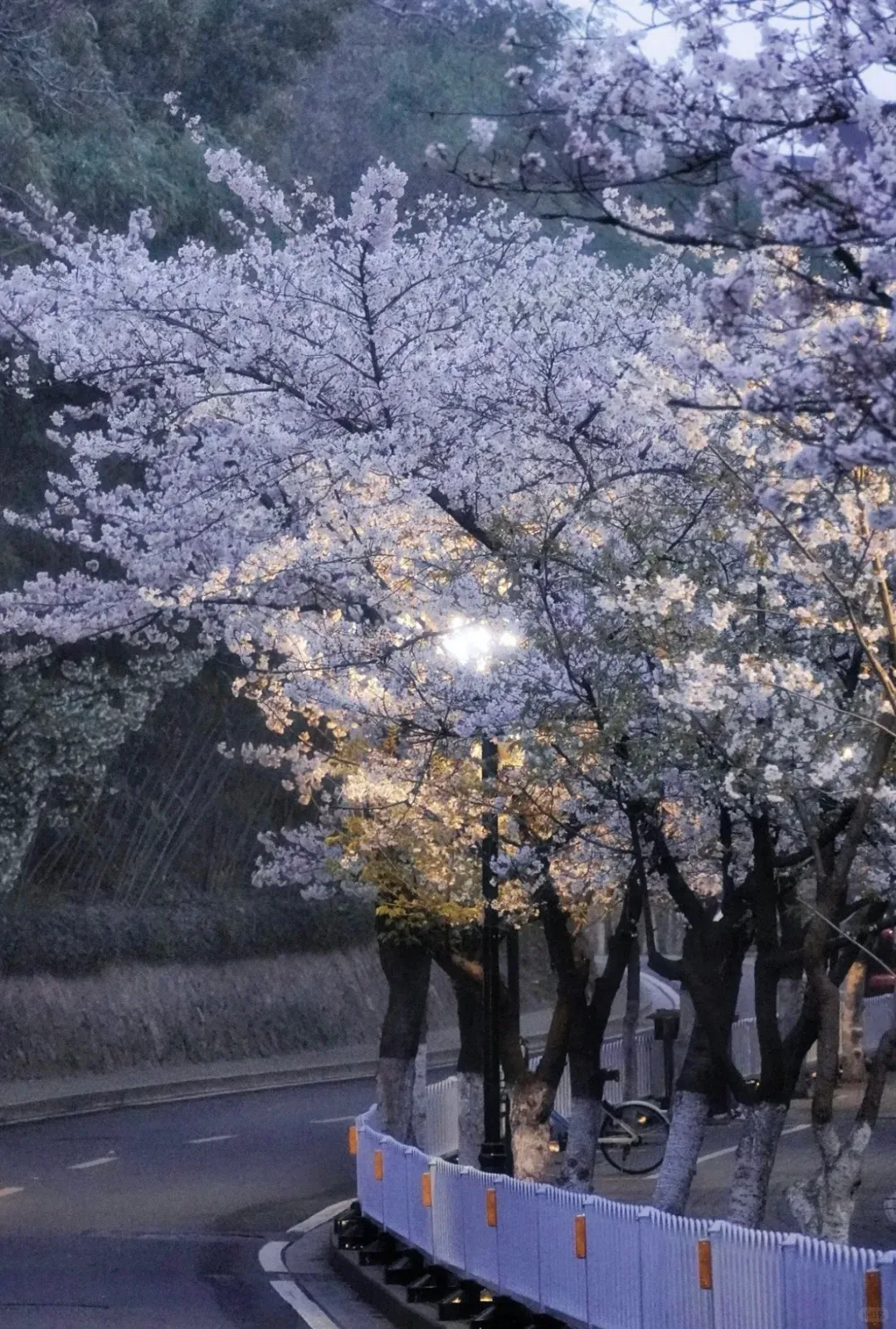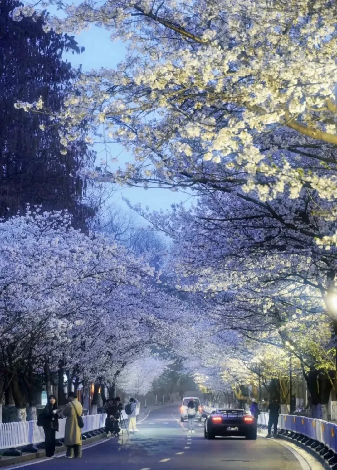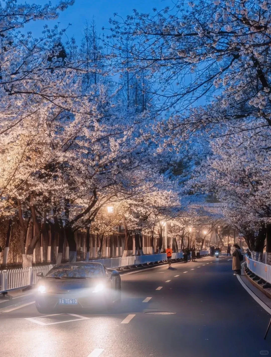 车灯的暖光、路灯的柔光、晚风的轻拂,再配上满树粉白樱花,所有浪漫元素凑在一起,氛围感直接拉满。