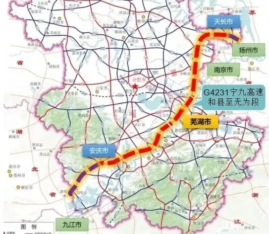 G4231南京至九江高速公路和县至无为段项目起点位于马鞍山市郑蒲港新区姥桥镇西北侧姥桥枢纽,线路整体呈东西走向,途经马鞍山市和县、含山县、郑蒲港新区以及芜湖市鸠江区、无为市,路线全长68.774公里。采用双向四车道全封闭高速公路标准建设,设计时速120公里。