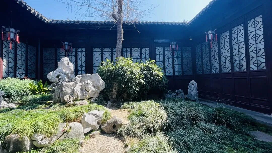 主厅静妙堂是刘姥姥进大观园、元妃省亲的核心取景处;临水厅堂,前对南假山、池水相映。