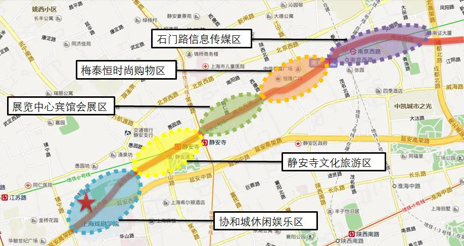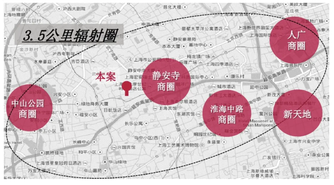 项目3.5公里内,10分钟车程即可辐射到达上海市中心优质商圈:静安寺商圈、淮海中路商圈、人民广场商圈、中山公园商圈、新天地商圈