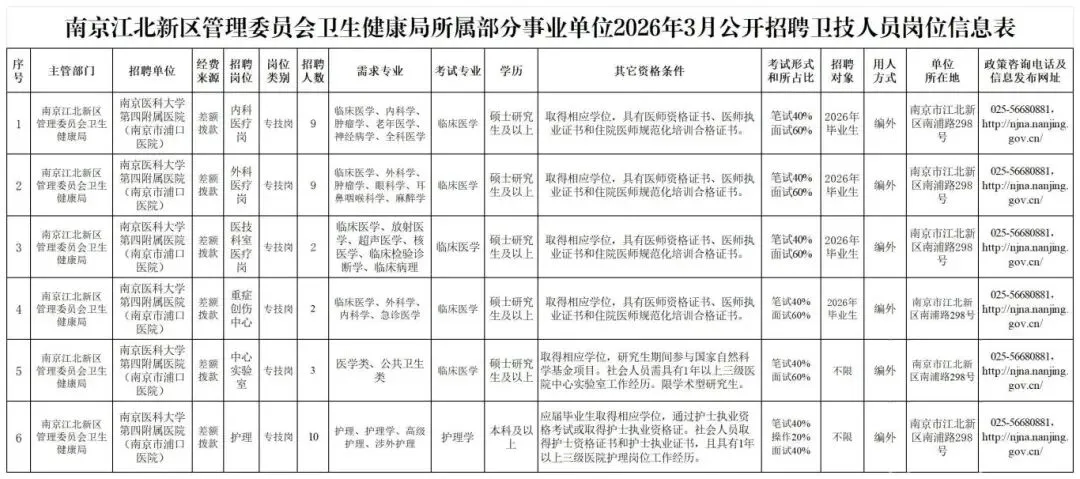 本次招聘相关信息在南京江北新区管理委员会网上发布。具体的招聘岗位、数量、资格条件等详见《南京江北新区管理委员会卫生健康局所属部分事业单位2026年3月公开招聘卫技人员岗位信息表》。