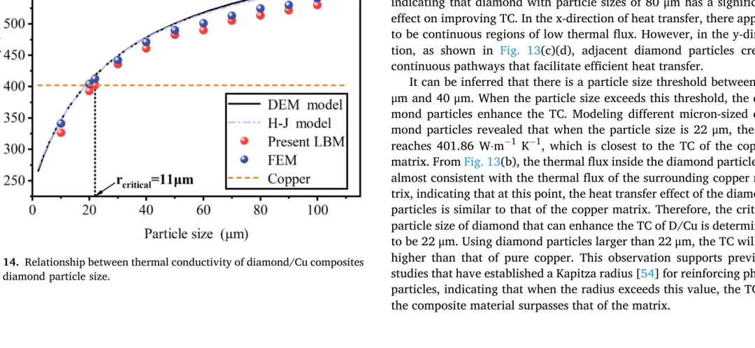图2 热导率随金刚石颗粒尺寸的变化曲线及与理论模型的对比。LBM结果与DEM和H-J模型趋势一致,但略低于理论预测,这可能是由于理论模型未考虑颗粒形状效应。