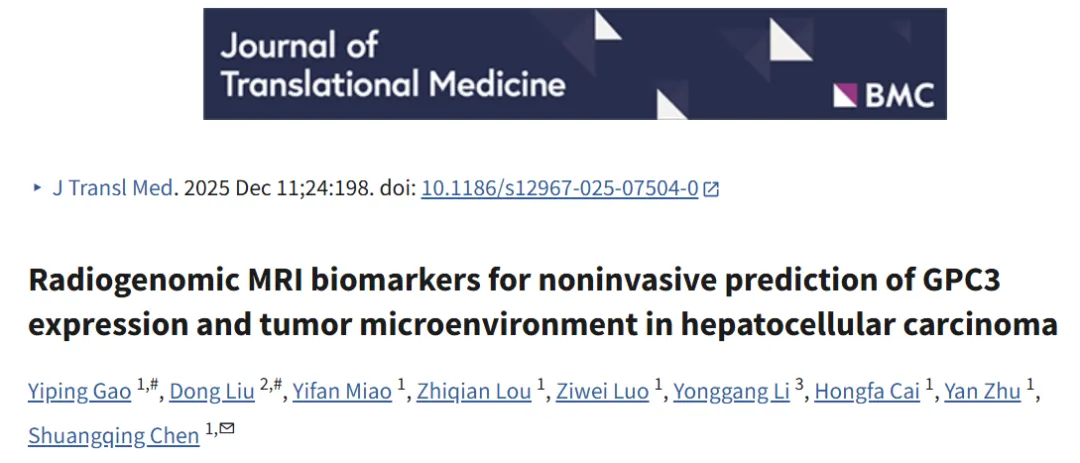 Gao Y, Liu D, Miao Y, Lou Z, Luo Z, Li Y, Cai H, Zhu Y, Chen S. Radiogenomic MRI biomarkers for noninvasive prediction of GPC3 expression and tumor microenvironment in hepatocellular carcinoma. J Transl Med. 2025 Dec 11;24(1):198. doi: 10.1186/s12967-025-07504-0. PMID: 41382212; PMCID: PMC12903299.