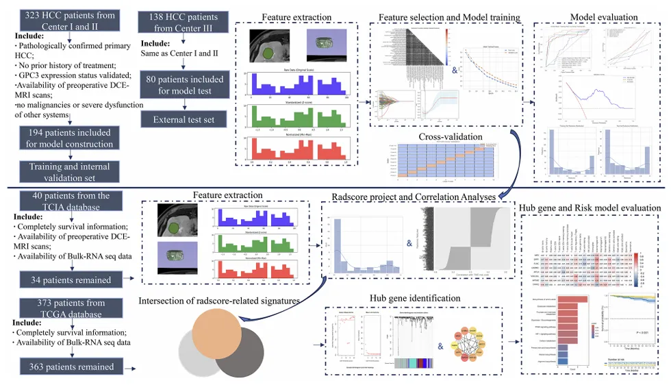 这篇文章主要研究了如何利用MRI影像组学结合基因组学分析,无创预测肝细胞癌(HCC)中 GPC3 表达状态 及其相关肿瘤微环境特征。作者纳入多中心MRI队列,提取肿瘤及瘤周影像特征,建立机器学习模型,发现基于CE-T1WI和DWI的模型对GPC3预测具有较好性能。进一步结合TCGA和TCIA转录组数据进行放射基因组学分析,发现影像特征与缺氧、脂质代谢、HIF-1/PPAR通路密切相关,并筛选出10基因风险特征,可区分不同预后亚群。高风险患者表现出更强免疫浸润和更可能从免疫治疗中获益。总体上,这项研究提示MRI影像可以作为GPC3及肿瘤微环境的替代标志物,为肝癌精准分层和个体化治疗提供依据。