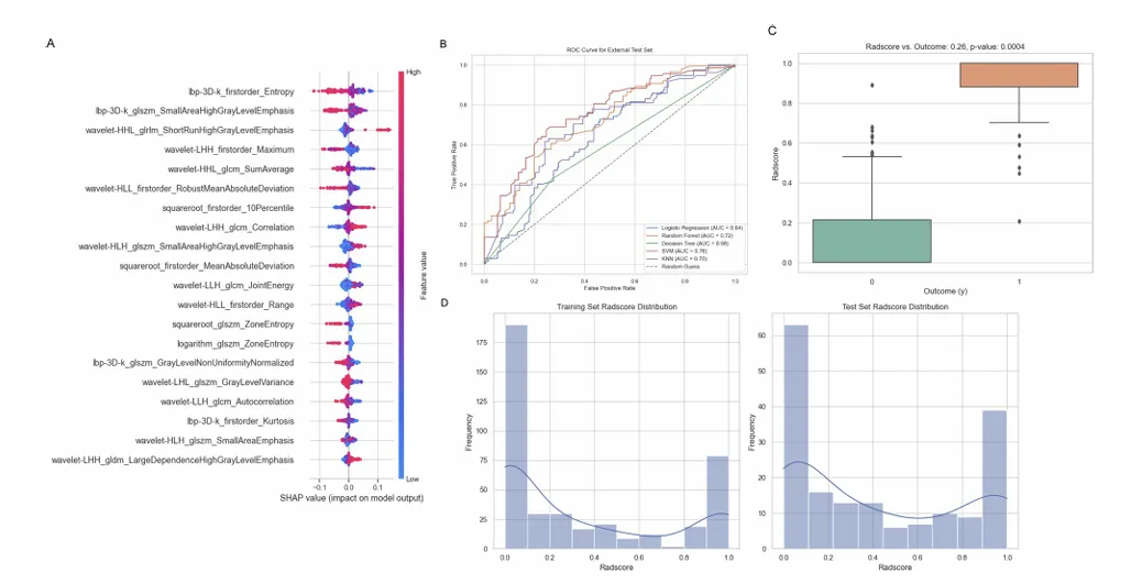 图 3 特征解释和外部验证。(A) Shap 分析确定了有助于 GPC3 预测的关键放射学特征。(B) 外部验证队列的 ROC 曲线,其中 SVM 表现最好 (AUC = 0.756),RF 表现出中等程度的泛化性 (AUC = 0.721)。(C) Spearman 相关性分析表明 radscore 与 GPC3 表达之间存在强相关性 (R = 0.78,p < 0.05)。(D) radscore 分布确认了高风险和低风险组的稳健分层。