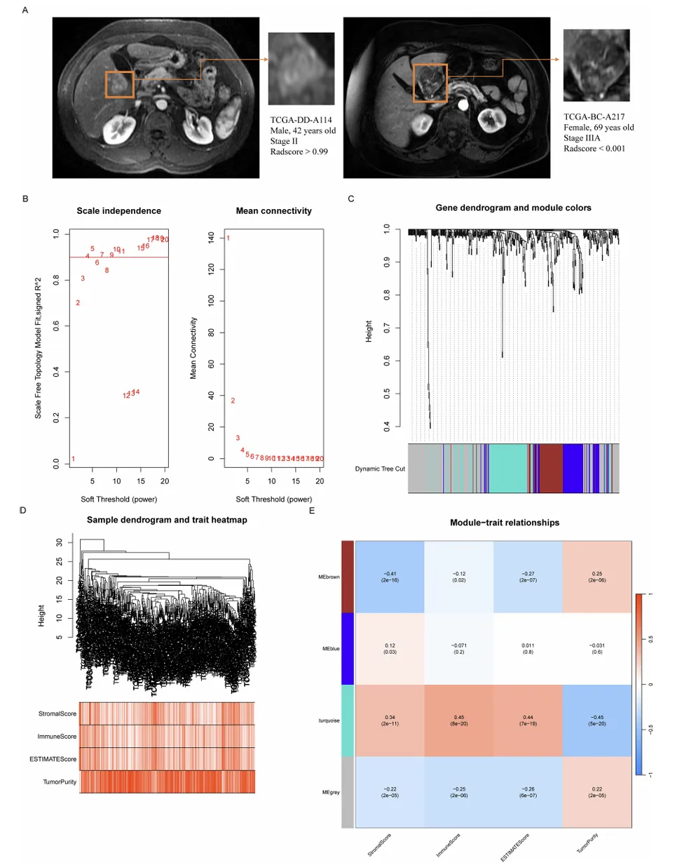 图1:整个研究的工作流程和注册过程。研究设计的示意图表示,说明多中心数据采集、DCE-MRI 分割和特征提取、多组学集成、预后模型开发和验证工作流程。关键步骤包括数据归一化、机器学习模型训练、WGCNA 模块分析以及生存和肿瘤微环境 TME 特征化。