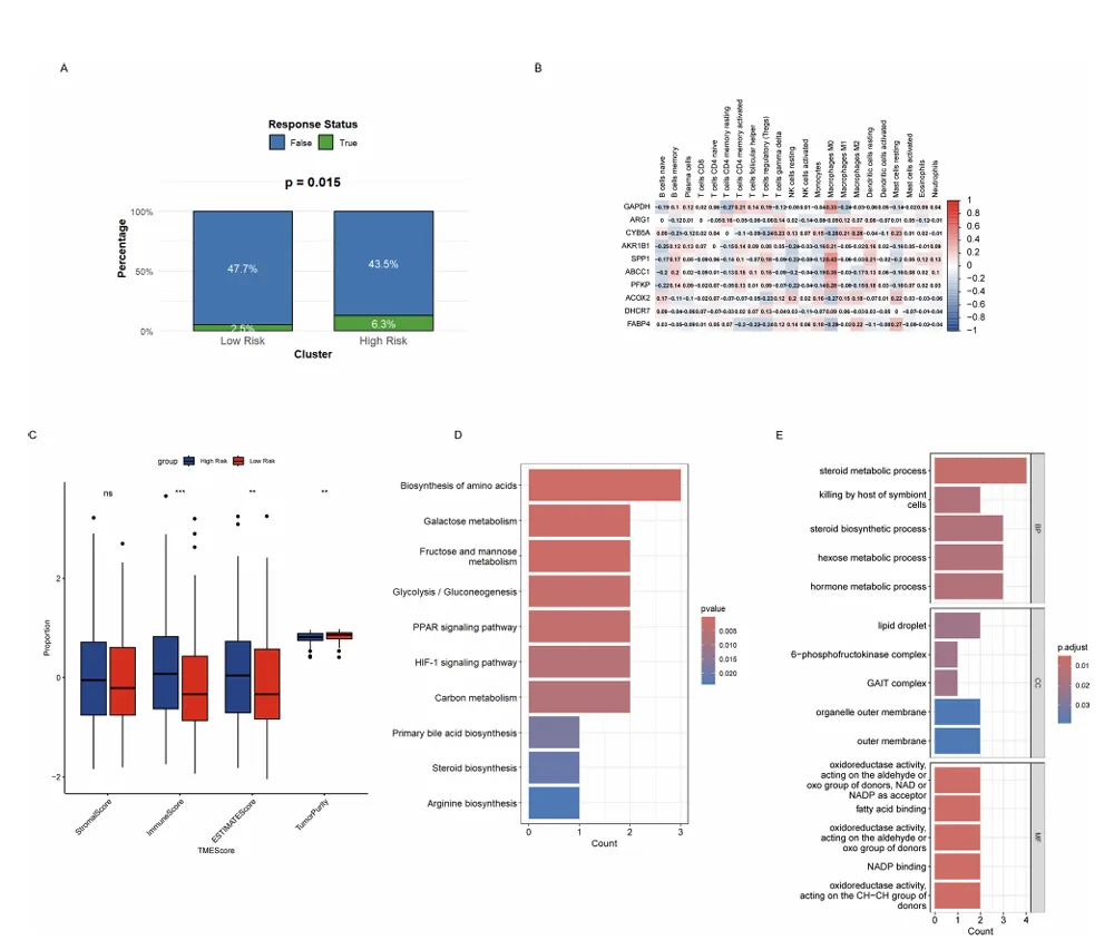 图 6 免疫相关反应和富集分析。(A) 潮汐评分 (显示高风险组具有较低的潮汐评分,这与更好的反应相关)。(B) 来自 CIBERSORT 分析的中心基因与 22 个肿瘤浸润性免疫细胞亚群之间相关性的热图。(C) 高风险组和低风险组之间的 StromalScore、ImmuneScore、ETIMATEScore 和 tumorPurity 的比较。(D) 中心基因的 KEGG 途径富集分析,突出显示参与代谢重编程的途径,如糖酵解/糖异生、HIF-1 和 PPAR 信号传导。(E) 进行富集分析,显示中心基因参与类固醇代谢和氧化还原酶活性等过程。