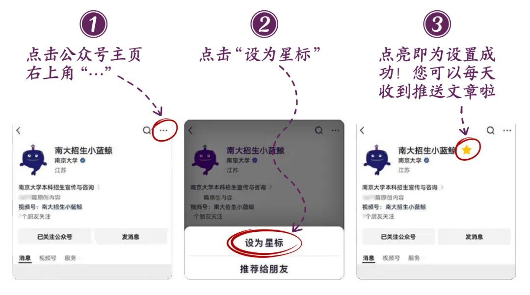 Tip:亲爱的考生和家长,感谢您对南京大学的关注。为了让每一条关键的招生资讯、每一份真诚的校园故事都能准确送达您身边,建议您按照下方指引,将“南大招生小蓝鲸”设为星标。