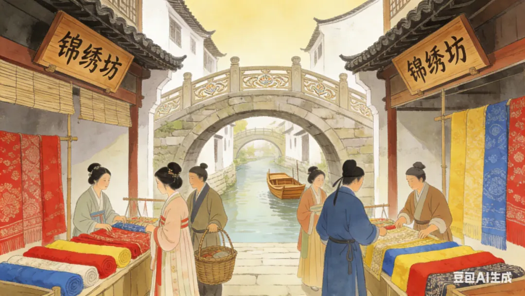 宋灭南唐,金陵改称升州、江宁府,南唐宫城改为州府衙署。南宋建炎三年(1129年),金陵改名建康,定为行都,行宫依宫城旧址而建,东、西锦绣坊成为行宫外围核心街市。《景定建康志》载,此处织锦作坊、绸缎庄、茶坊酒肆鳞次栉比,机杼声昼夜不绝,“锦绣”之名名副其实。