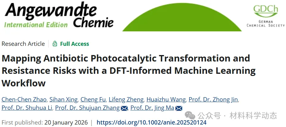 2026年1月20日,南京大学张淑娟,马晶在国际知名期刊Angewandte Chemie International Edition发表题为《Mapping Antibiotic Photocatalytic Transformation and Resistance Risks with a DFT-Informed Machine Learning Workflow》的研究论文,Chen-Chen Zhao为论文第一作者,张淑娟,马晶为论文共同通讯作者。