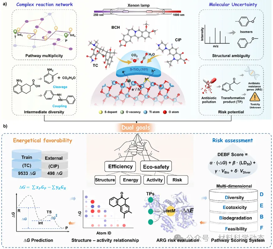 图1:风险-效率双目标工作流程。以S-TiO2为催化剂,耦合实验、HRMS、DFT与ML,构建DEBF多维度评分框架,实现对抗生素光催化转化路径的反应活性与生态风险同步评估。