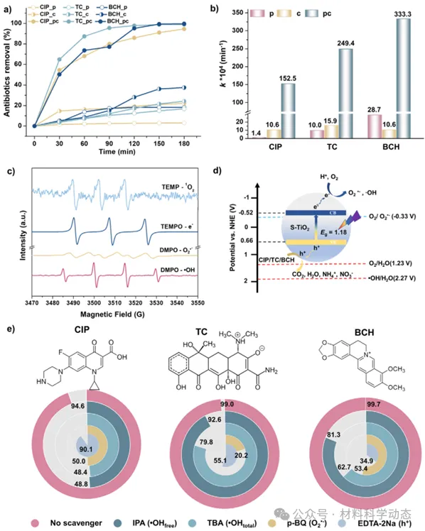 图2:抗生素可见光催化降解性能与活性物种识别。S-TiO2在180 min内对TC、CIP、BCH去除率>94%,EPR与淬灭实验揭示·OH、O2·−、h+等ROS贡献度因抗生素结构差异而呈现明显选择性。