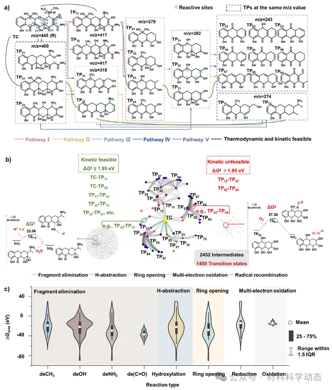 图3:TC降解路径与反应网络。LC-MS锁定45种中间体,构建含9533步反应的网络,DFT计算显示去羰基、脱氨、开环步骤热力学最利,绿色边标注≤1.95eV低势垒可行路线。