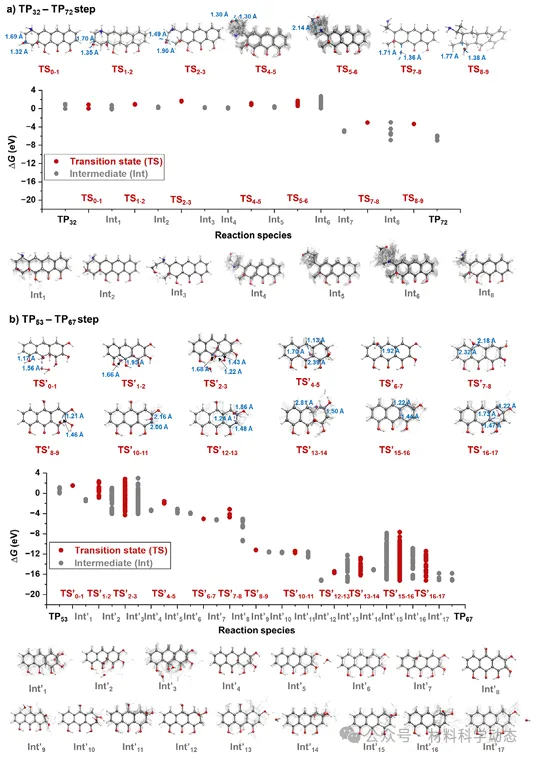图4:关键转化步骤的完整能量剖面。TP32→TP72与TP53→TP67两条路径的逐步Gibbs自由能与过渡态结构被解析,速率控制步势垒0.43–1.95 eV,证实光催化条件下动力学可及。