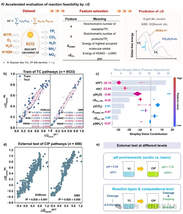 在本文中,作者构建了一个耦合光催化实验、高分辨质谱、密度泛函理论(DFT)计算与机器学习(ML)的预测框架,用于评估TPs的风险。以四环素为模型,构建了包含120步、9533条反应的反应网络,并训练ML模型以DFT精度快速预测吉布斯自由能变化;集成自动过渡态搜索评价网络内的动力学可行性。该方法的普适性在涉及545条反应的五种不同抗生素路径中得到验证。