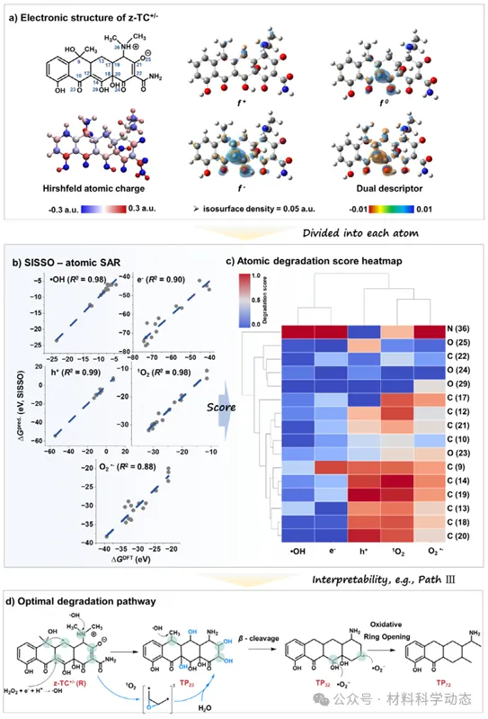 图6:原子级降解热点图谱。结合Fukui函数与SISSO回归,量化z-TC+/−各原子对·OH、e−、1O2等五类ROS的响应,C9、C12、N36等位点呈红色高敏区,指导构建代表性低能降解通道。