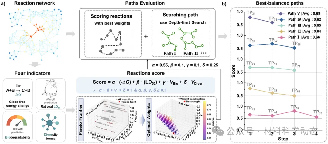 图7:DEBF多准则路径评分。将多样性、毒性、生物降解性、可行性归一化得分映射至三维,绿色低危优选路径集中在TC→TP11→TP43→TP67与TC→TP22→TP32→TP72,为后续实验验证提供靶线。