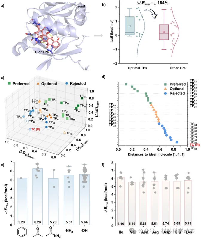 图8:ARG风险诱导评估。分子对接显示优选路径产物对tetM蛋白平均结合能降低0.66kcal mol-1,欧氏距离投影将TPs清晰分为低-中-高风险三区,证实所选路线可同步削弱抗性基因传播潜力。