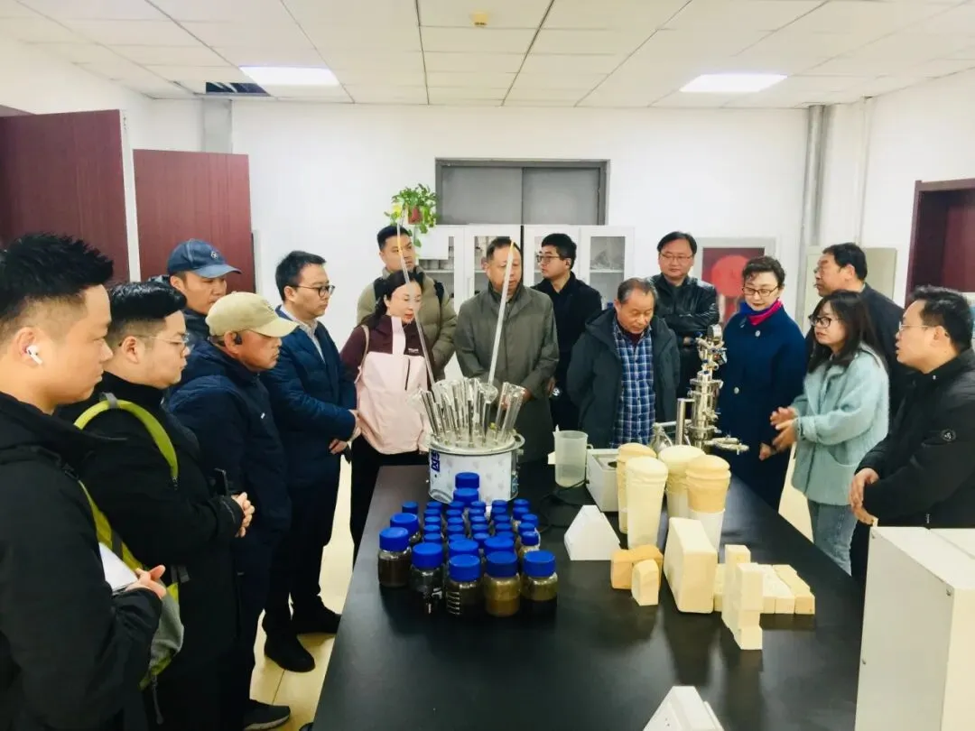 在废弃聚氨酯泡沫高值化资源利用项目部,考察团成员纷纷围拢在展台前,了解该所废弃聚氨酯泡沫高值化资源利用研究的成果介绍,许多人纷纷拿出手机拍下相关的介绍展板,询问废弃聚氨酯泡沫在后端处置上的相关技术问题及发展前景。