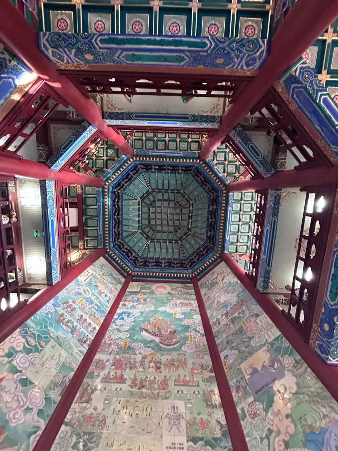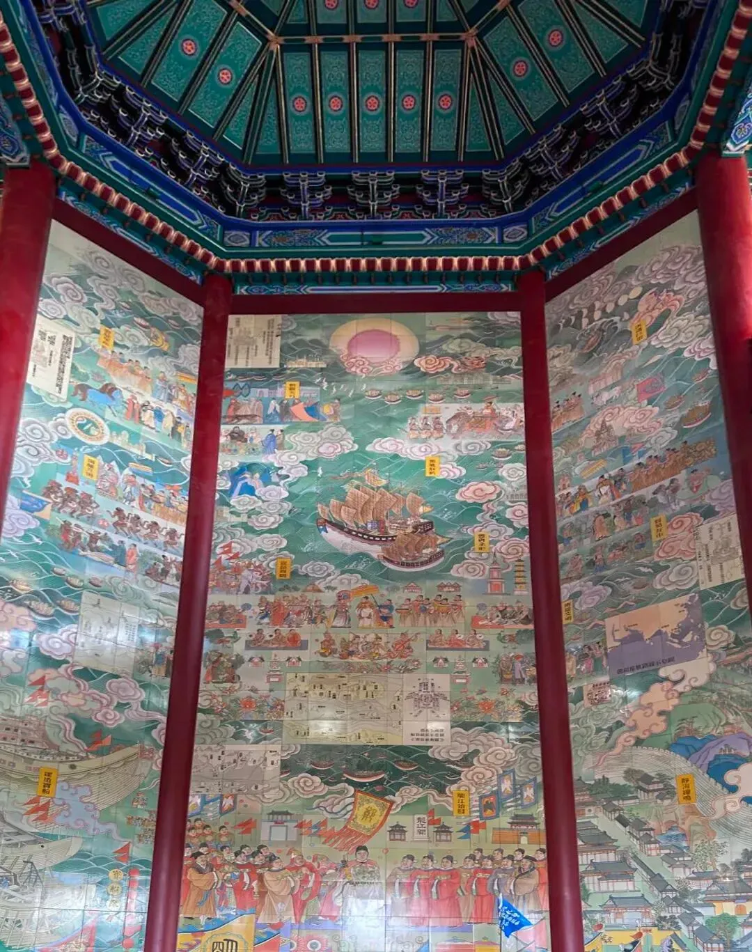 三楼大厅的“郑和下西洋”巨幅瓷画,高12.8米,宽8米,全景式描绘了郑和七下西洋的盛况——建造宝船、科学航海、和平外交、西洋各国风土人情,色彩斑斓,气势磅礴。