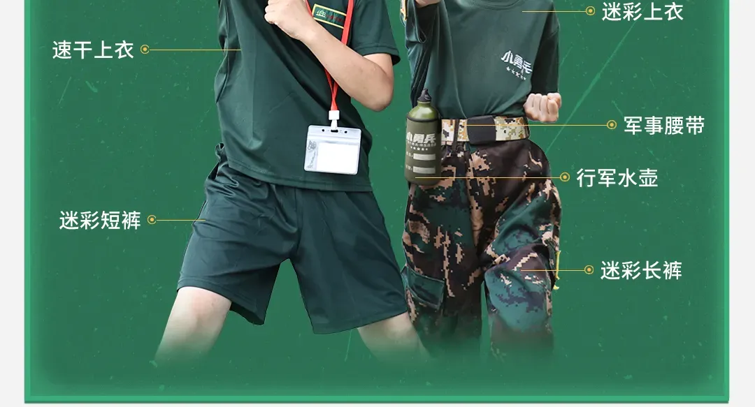 服装:两套作训服、军帽、军用水壶、腰带、手册;