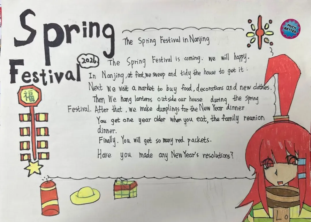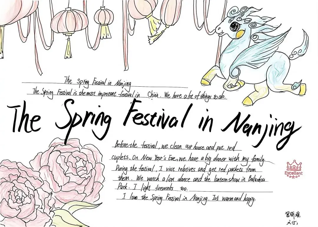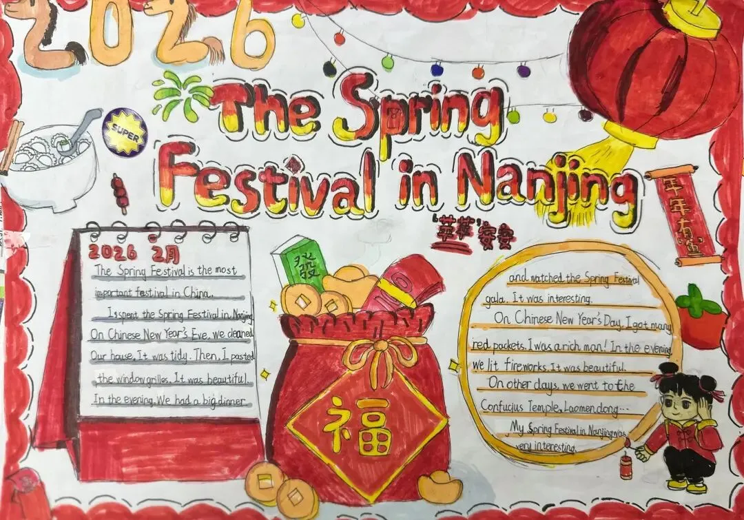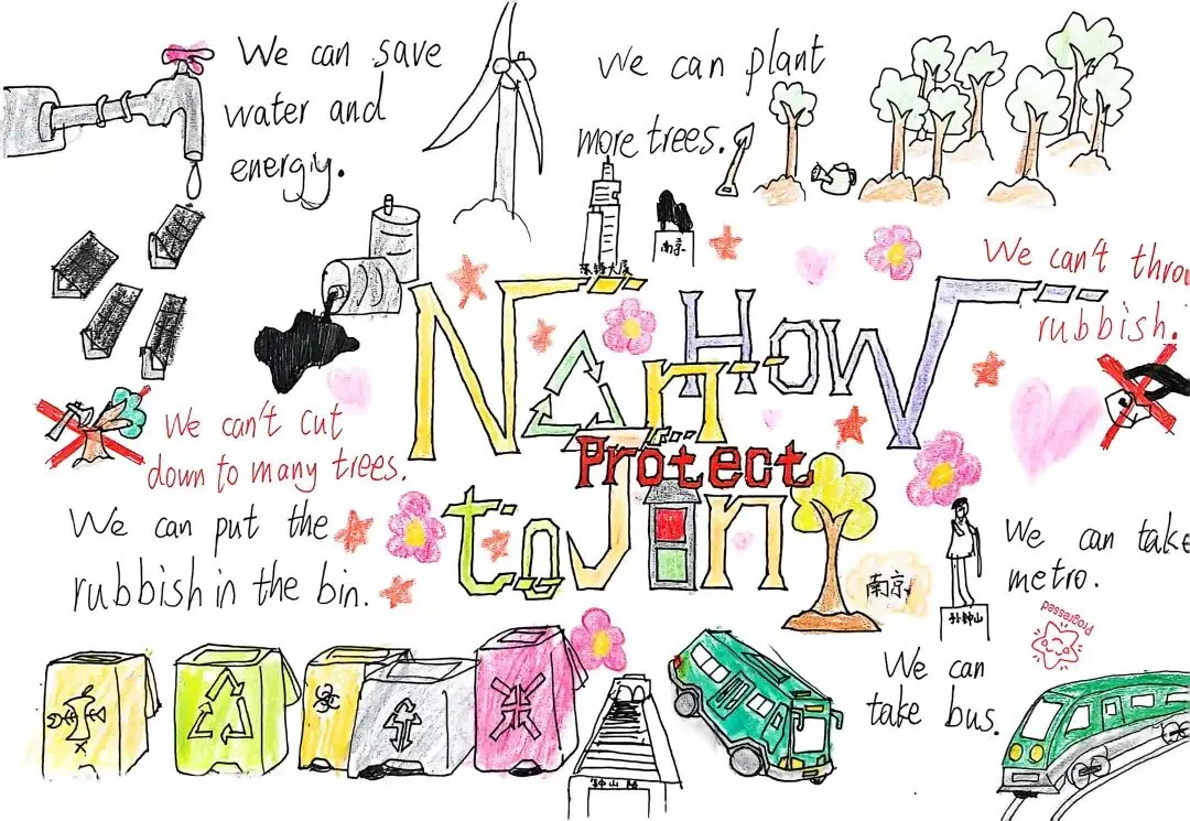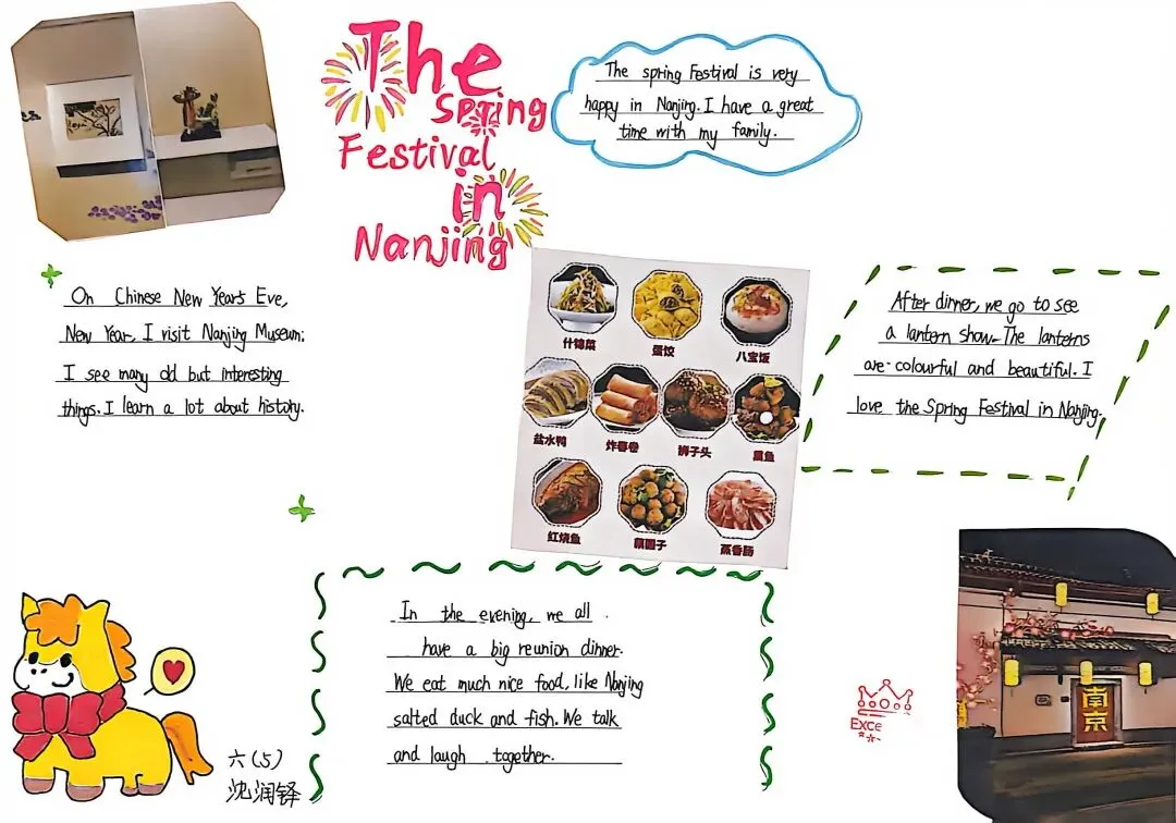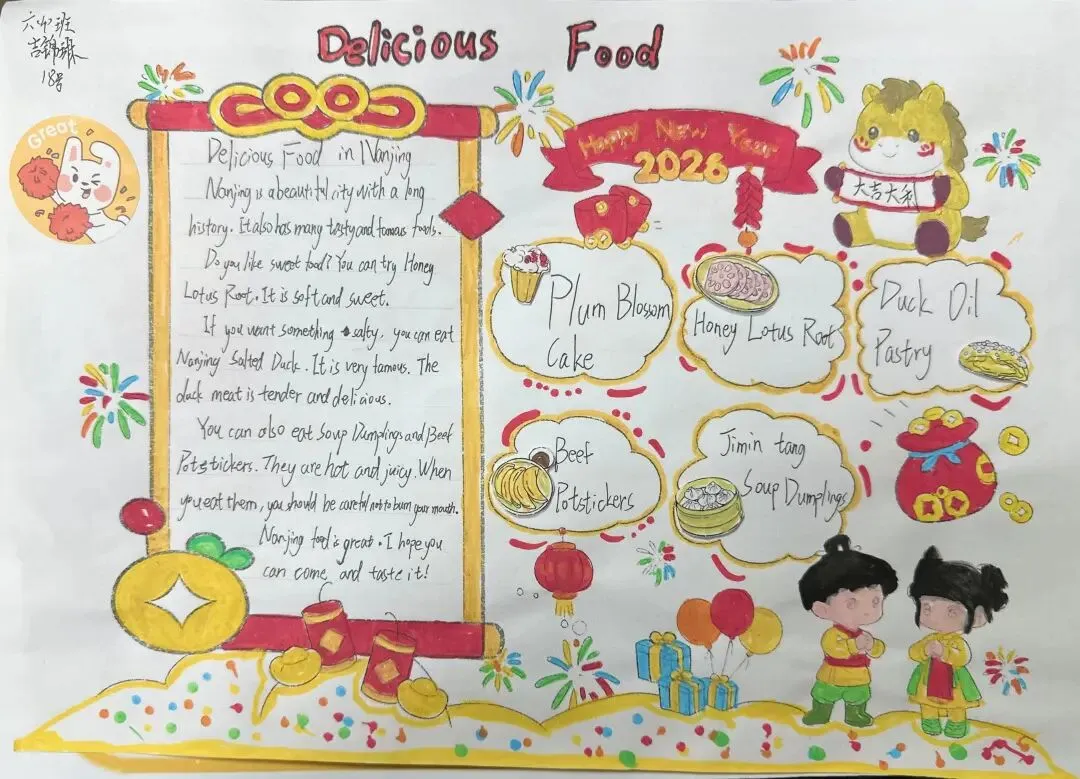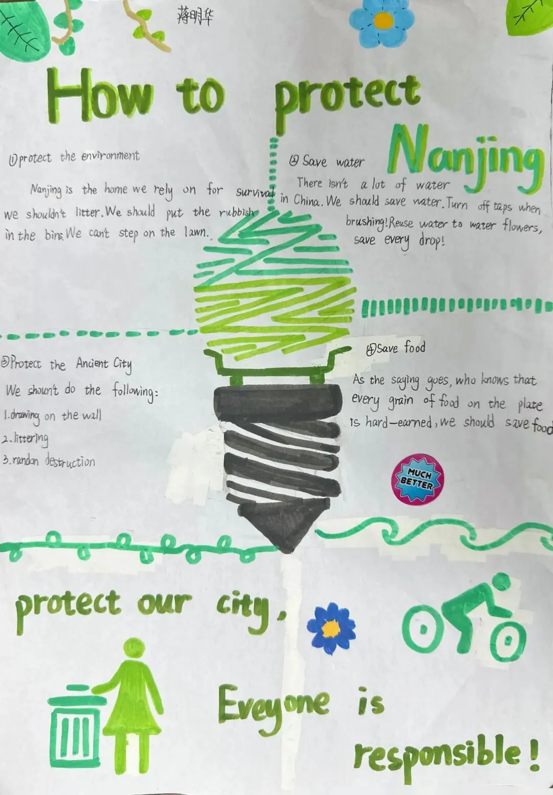 六年级的同学们则从My favourite food、A trip to...、The Spring Festival in Nanjing、Protect the Earth四大主题中选一自由创作,以更流畅的表达、更丰富的构思、更深刻的思考,呈现出别样的英语风采。