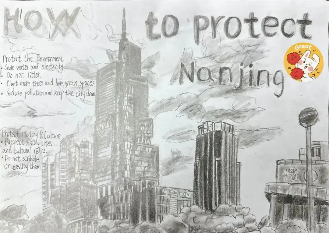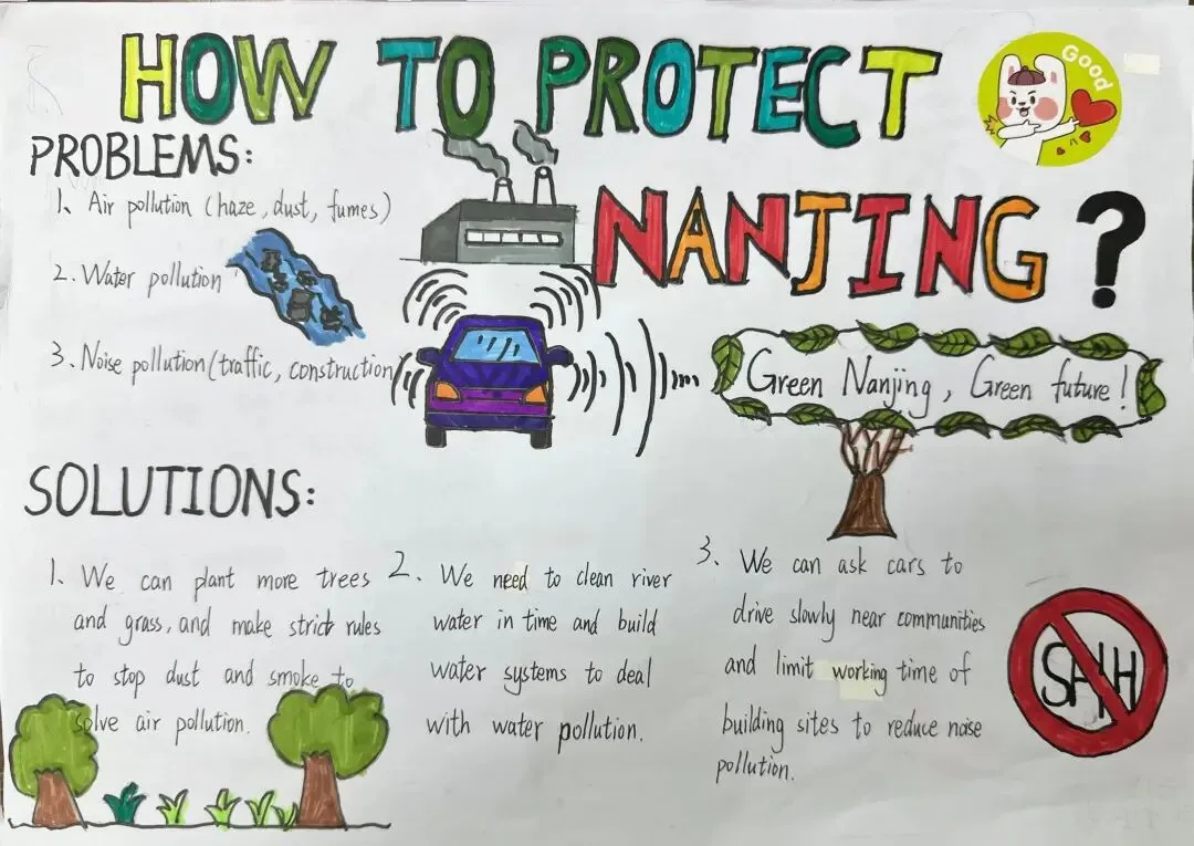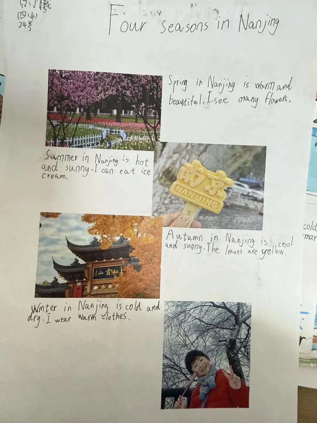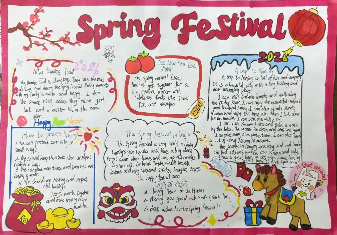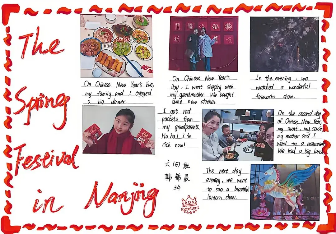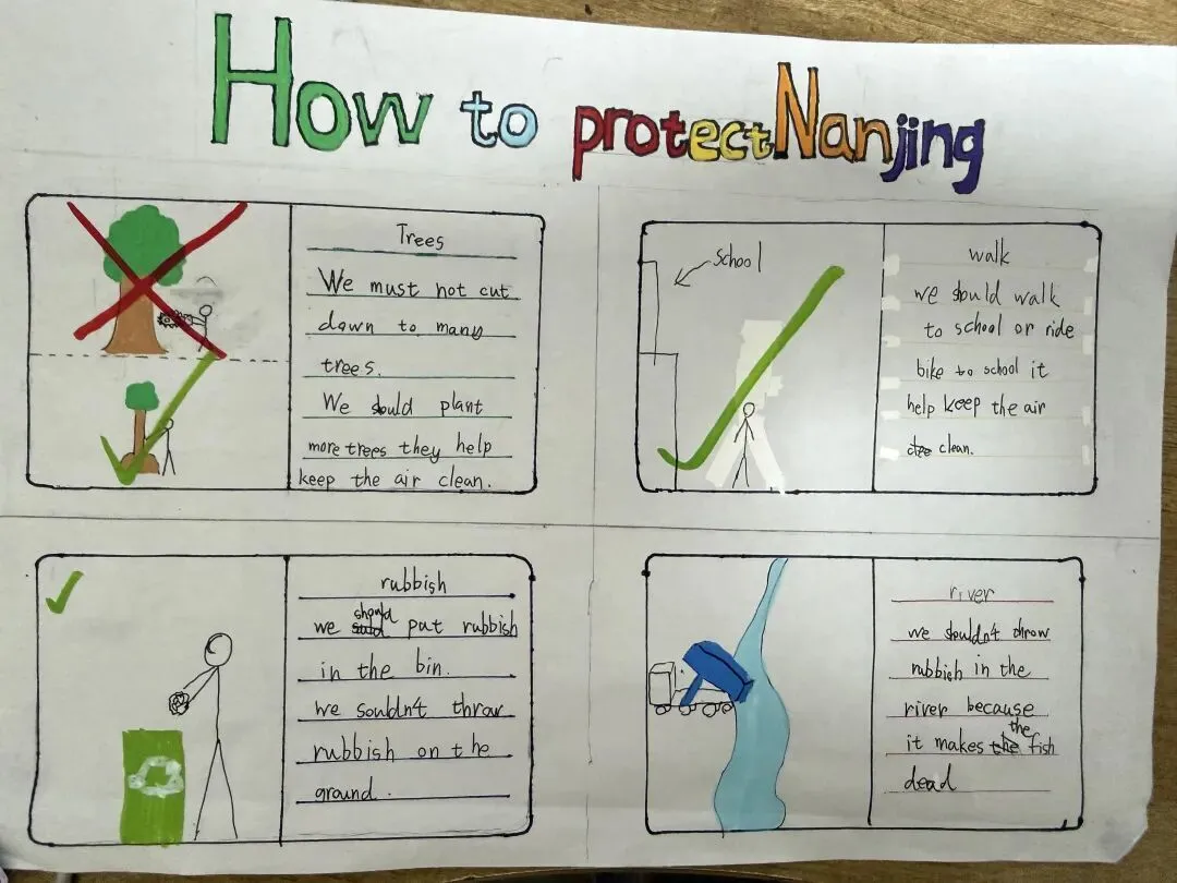 六年级的同学们则从My favourite food、A trip to...、The Spring Festival in Nanjing、Protect the Earth四大主题中选一自由创作,以更流畅的表达、更丰富的构思、更深刻的思考,呈现出别样的英语风采。