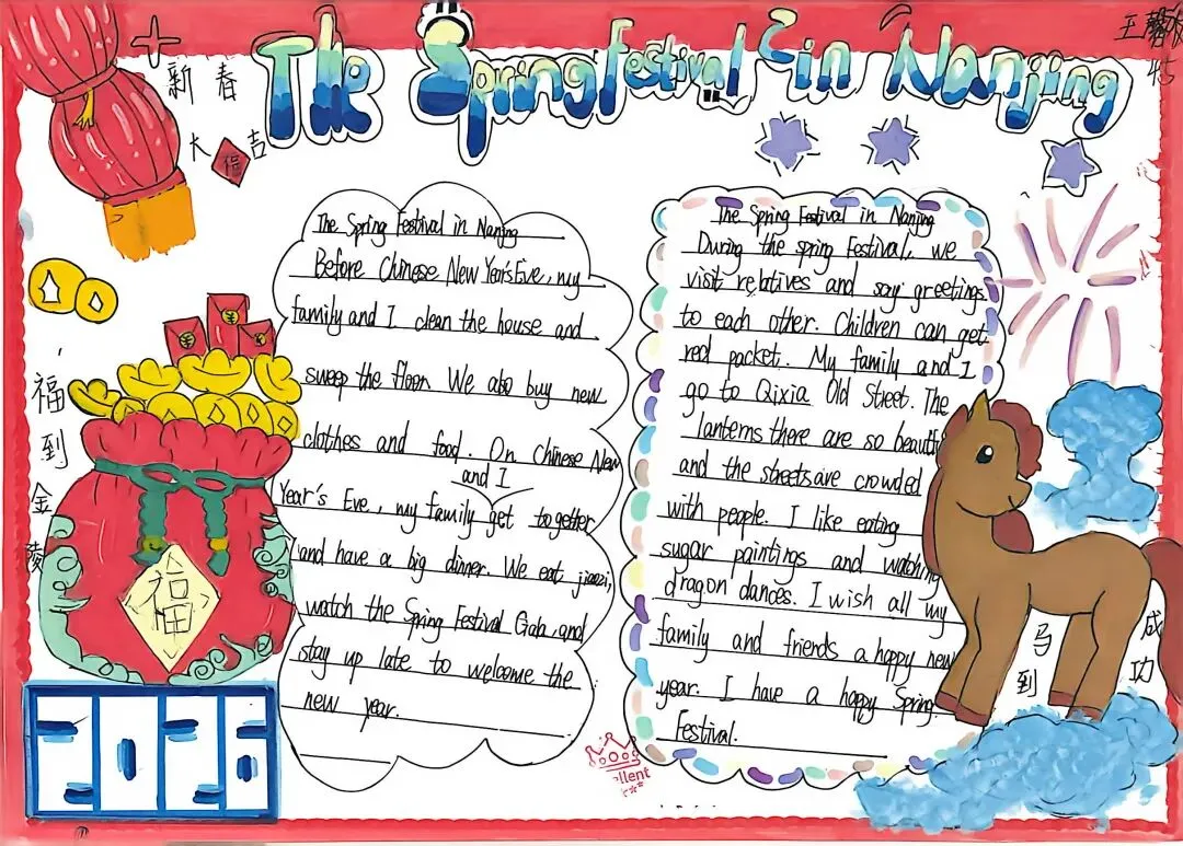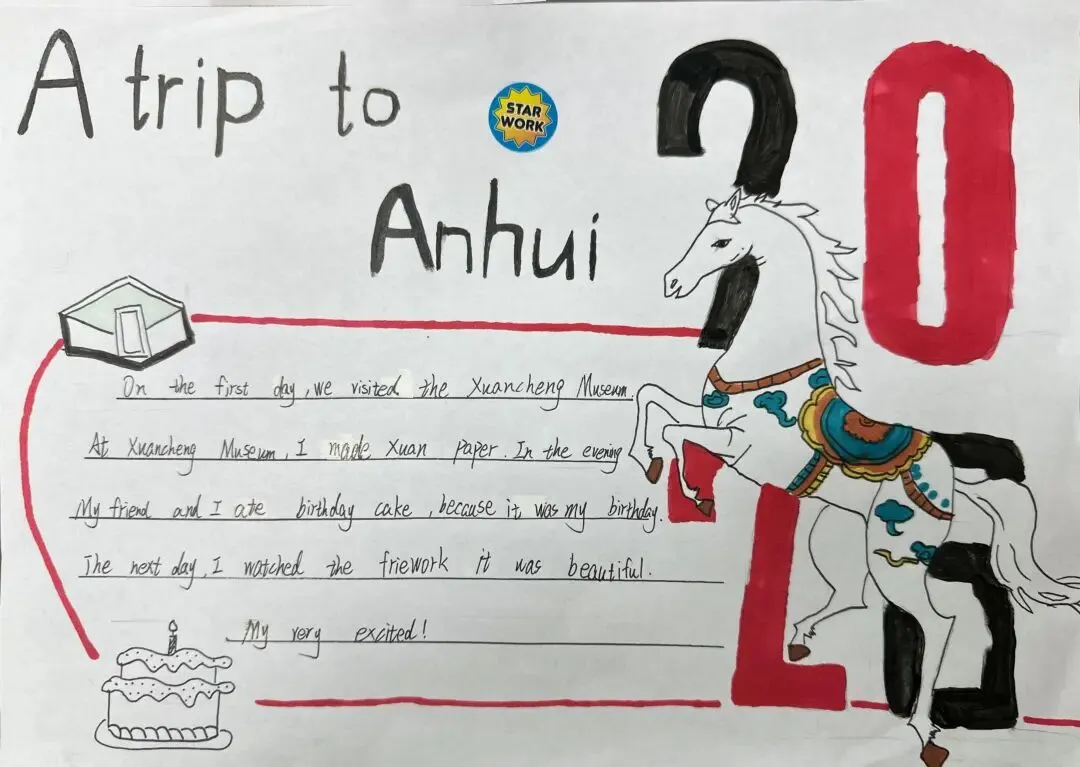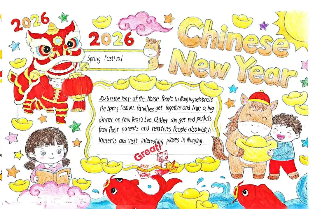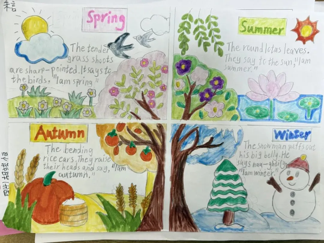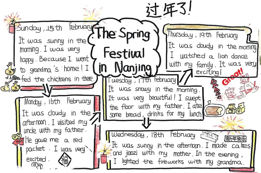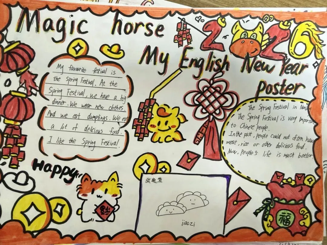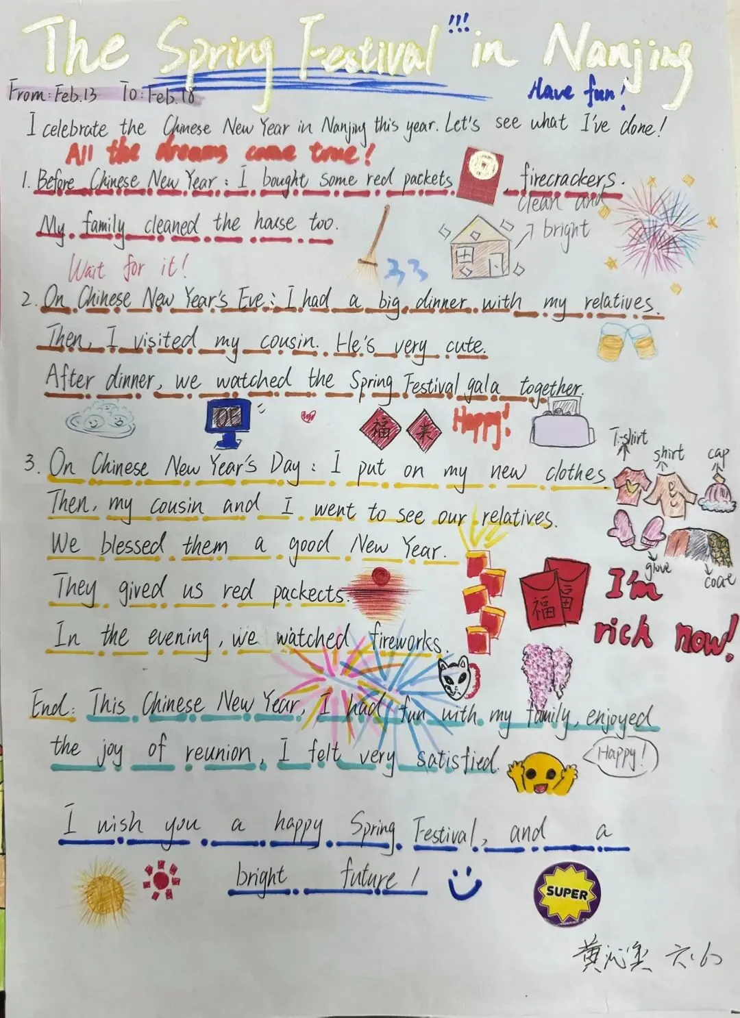 六年级的同学们则从My favourite food、A trip to...、The Spring Festival in Nanjing、Protect the Earth四大主题中选一自由创作,以更流畅的表达、更丰富的构思、更深刻的思考,呈现出别样的英语风采。