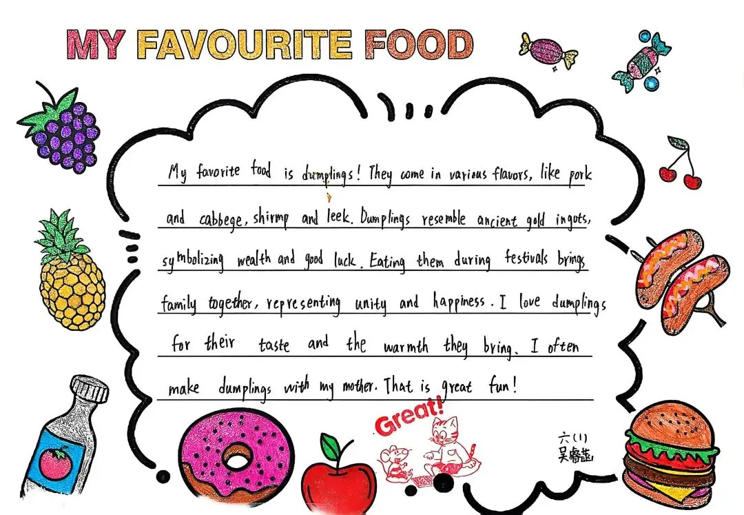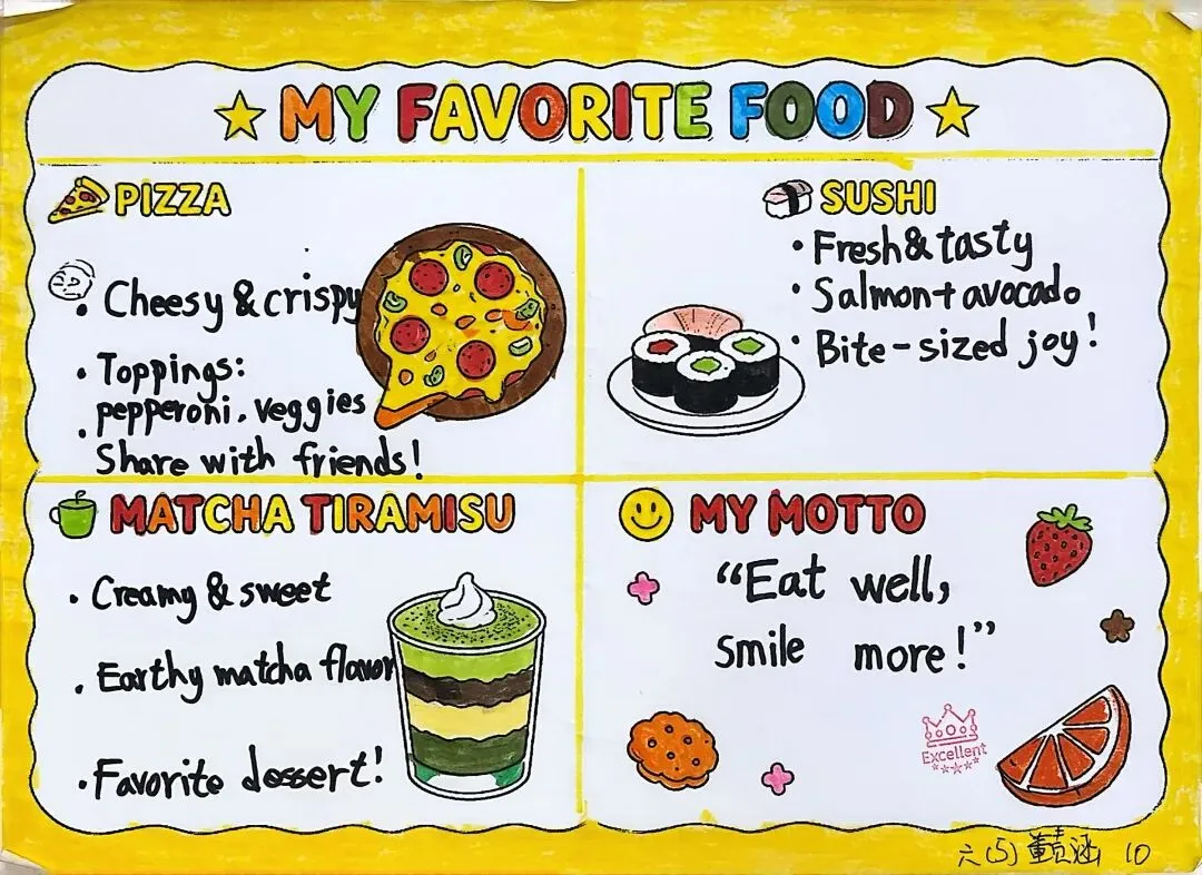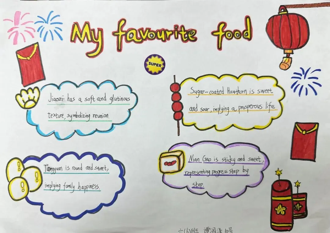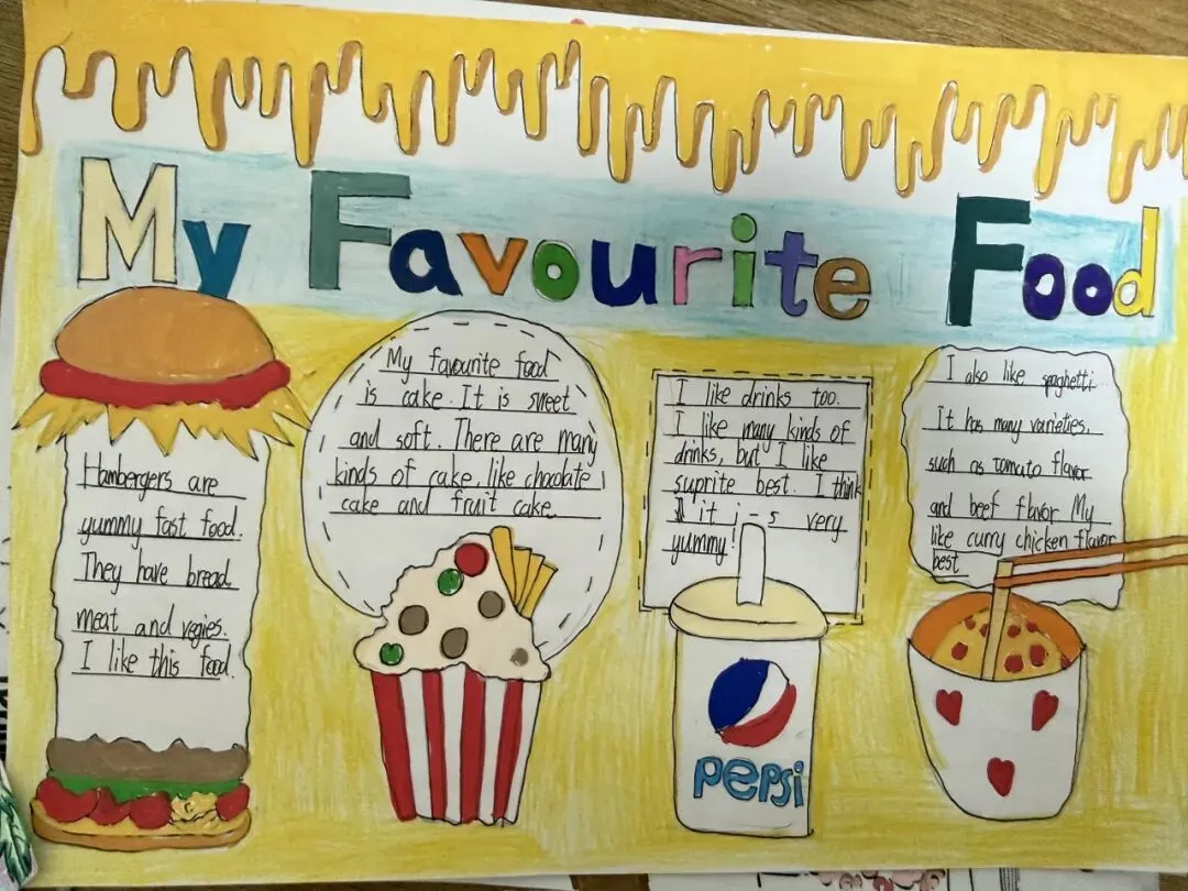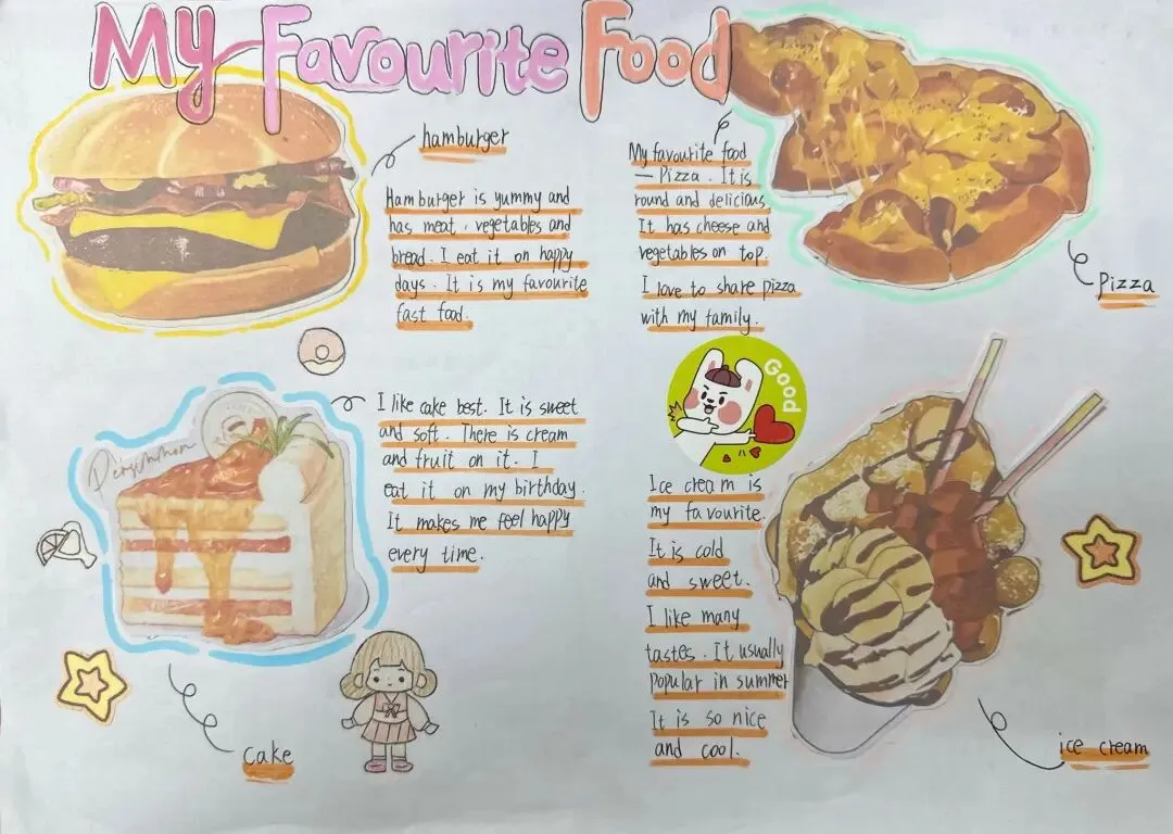 以My favourite food为主题的小报,同学们不仅细数美食的名称与滋味,更贴心分享简易制作步骤,融入健康饮食小知识,语言流畅,逻辑清晰。