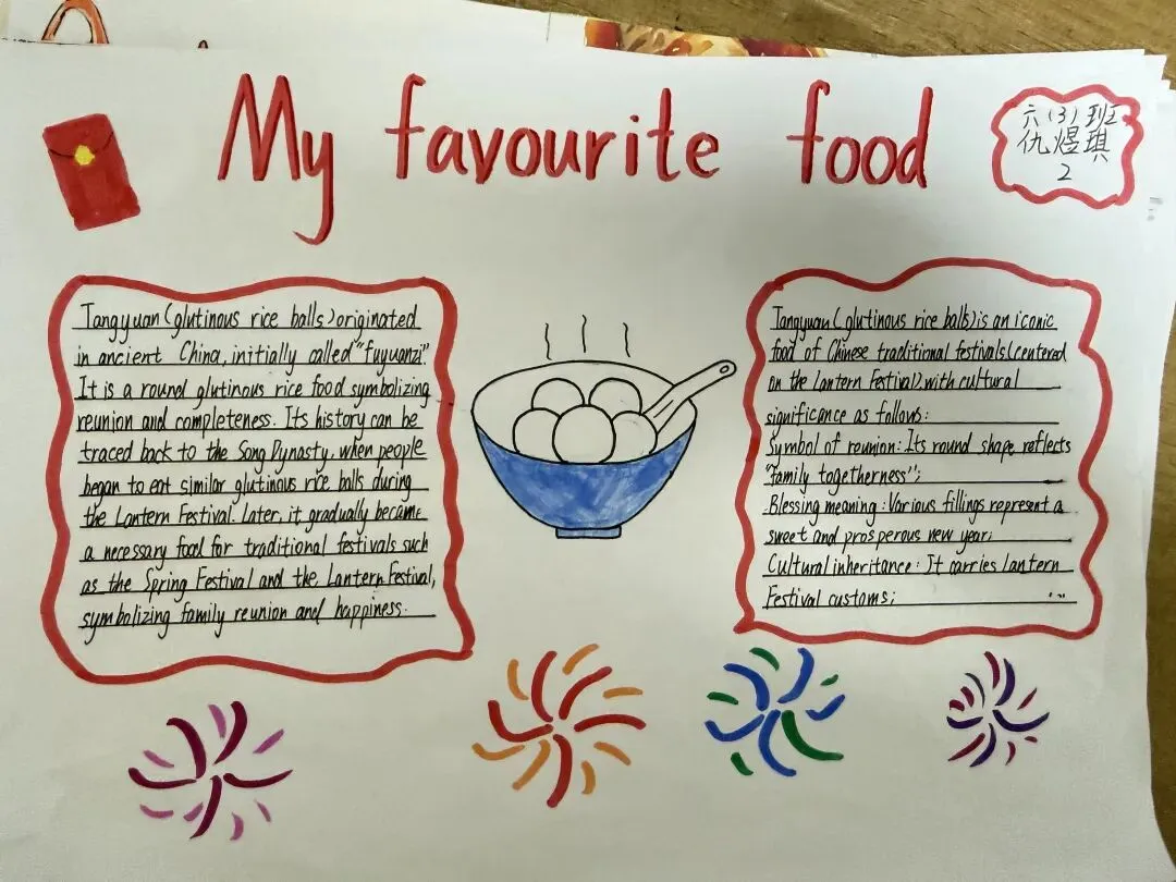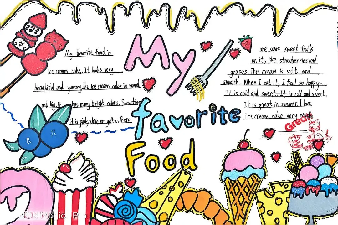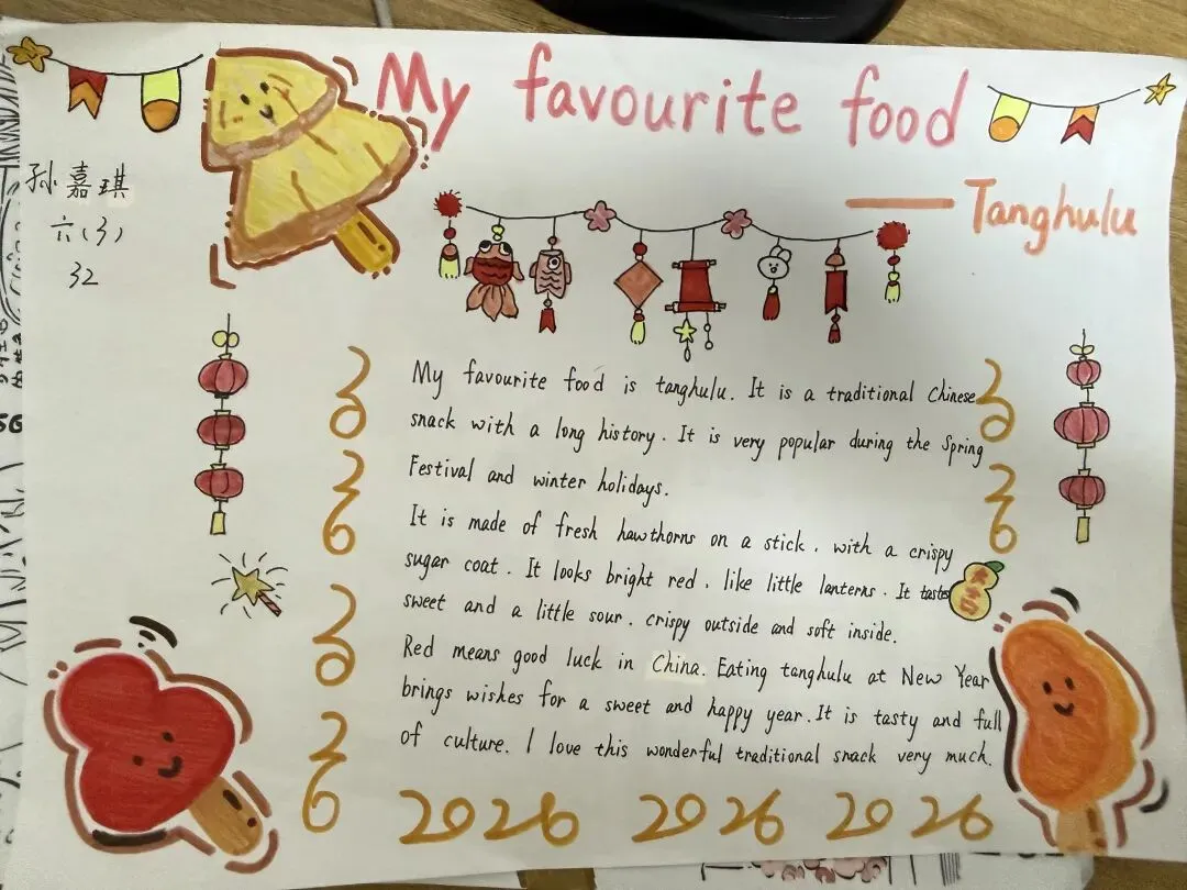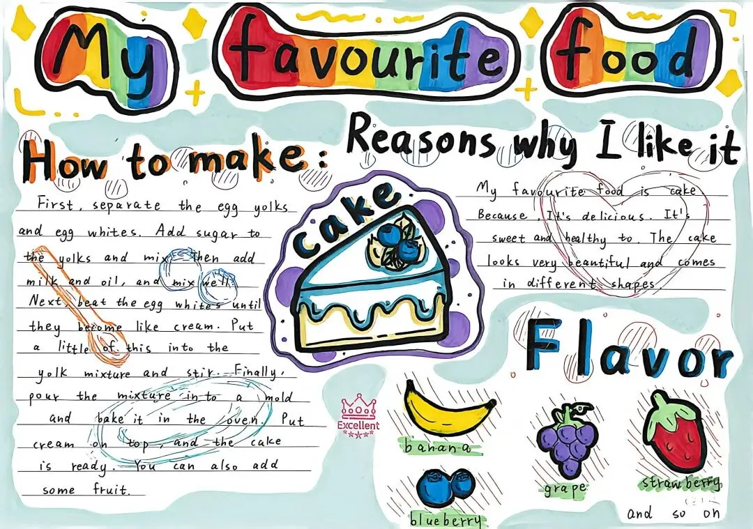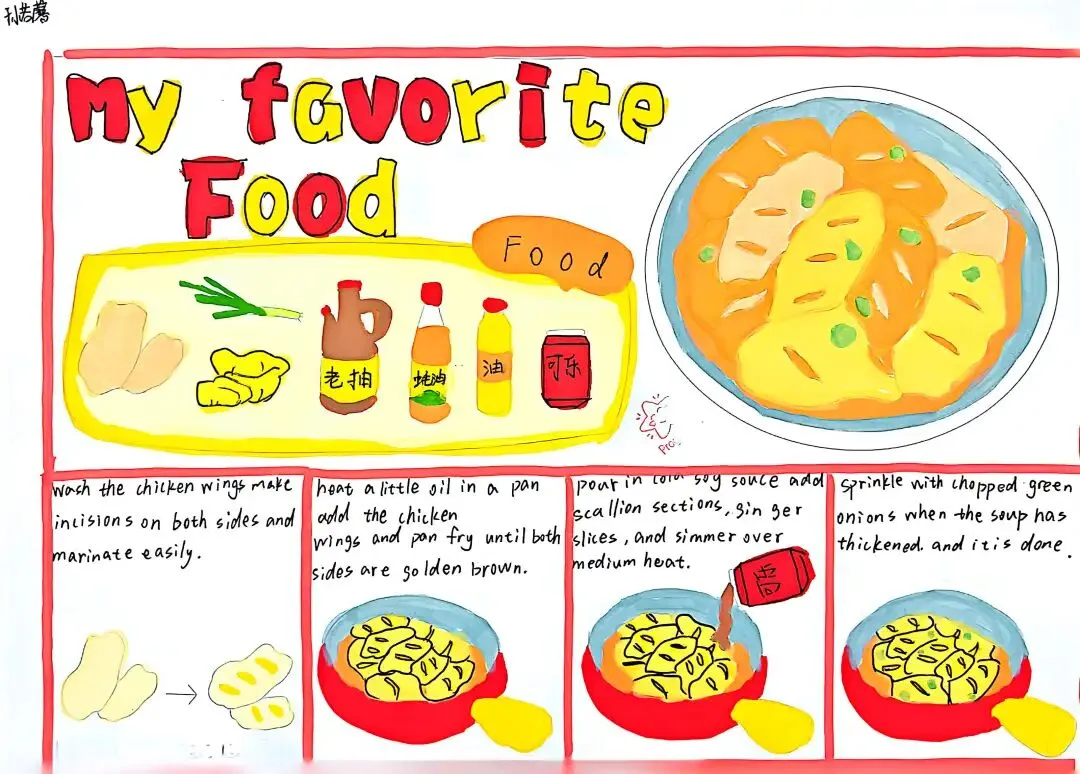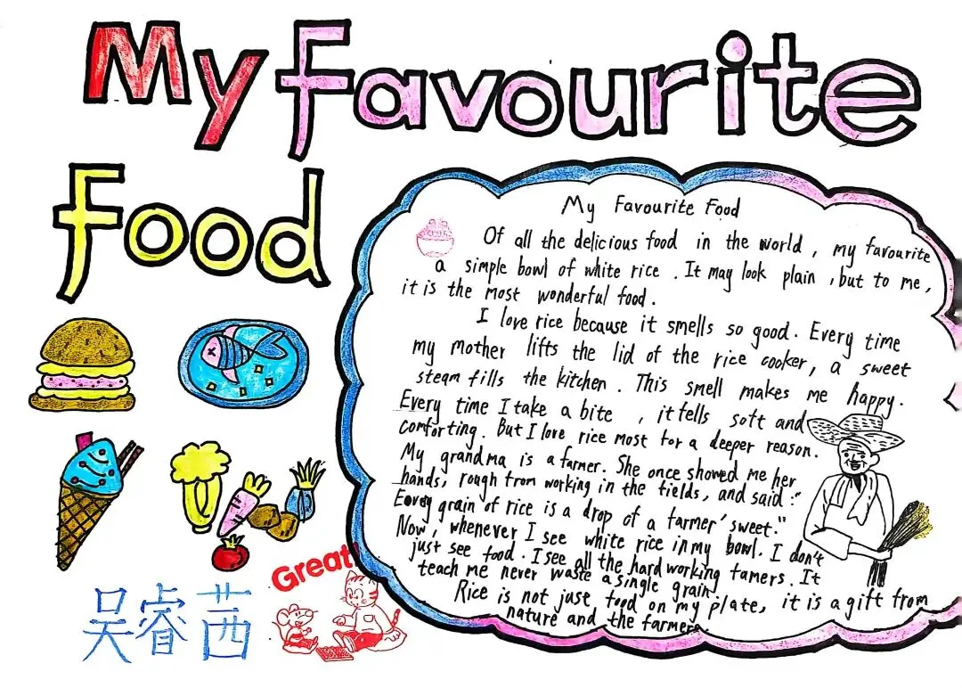 以My favourite food为主题的小报,同学们不仅细数美食的名称与滋味,更贴心分享简易制作步骤,融入健康饮食小知识,语言流畅,逻辑清晰。