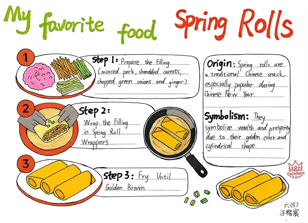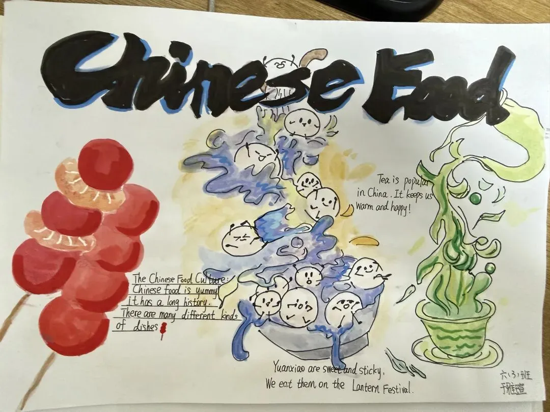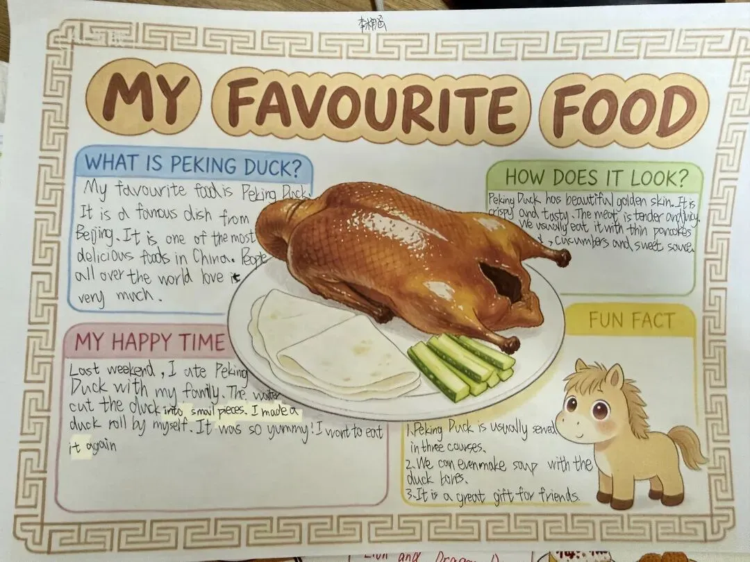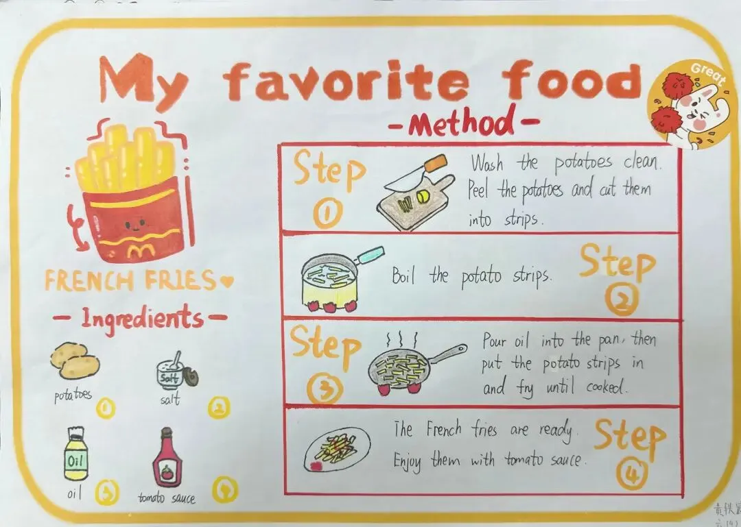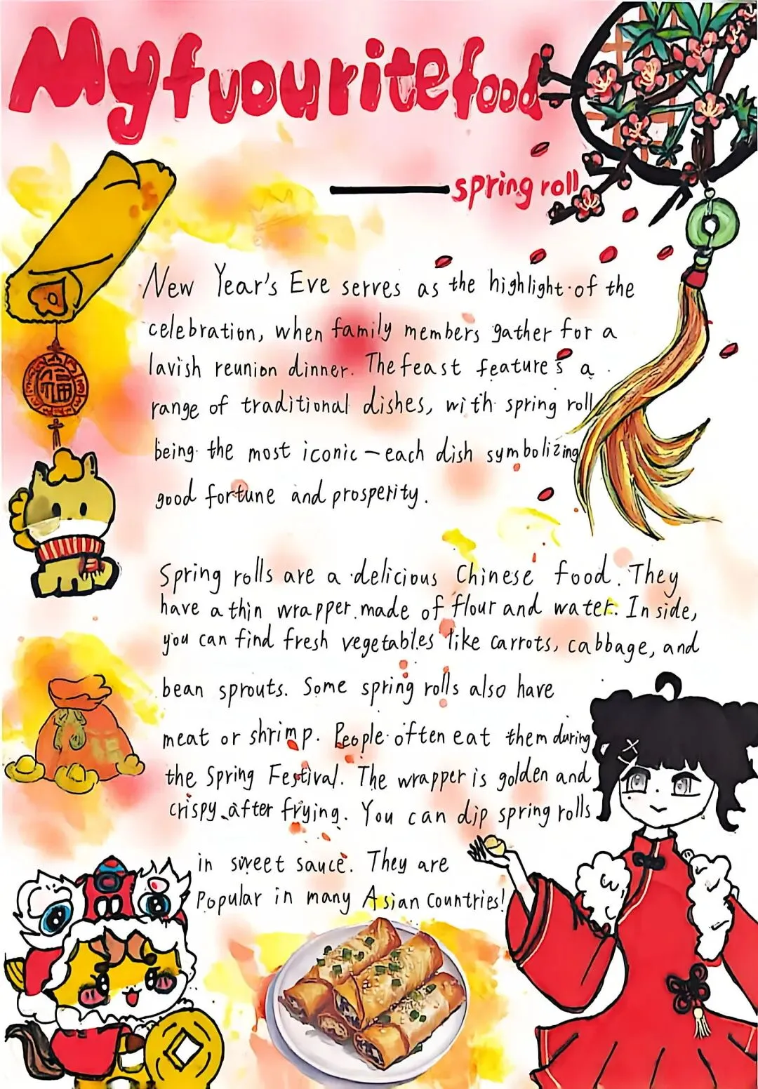 以My favourite food为主题的小报,同学们不仅细数美食的名称与滋味,更贴心分享简易制作步骤,融入健康饮食小知识,语言流畅,逻辑清晰。