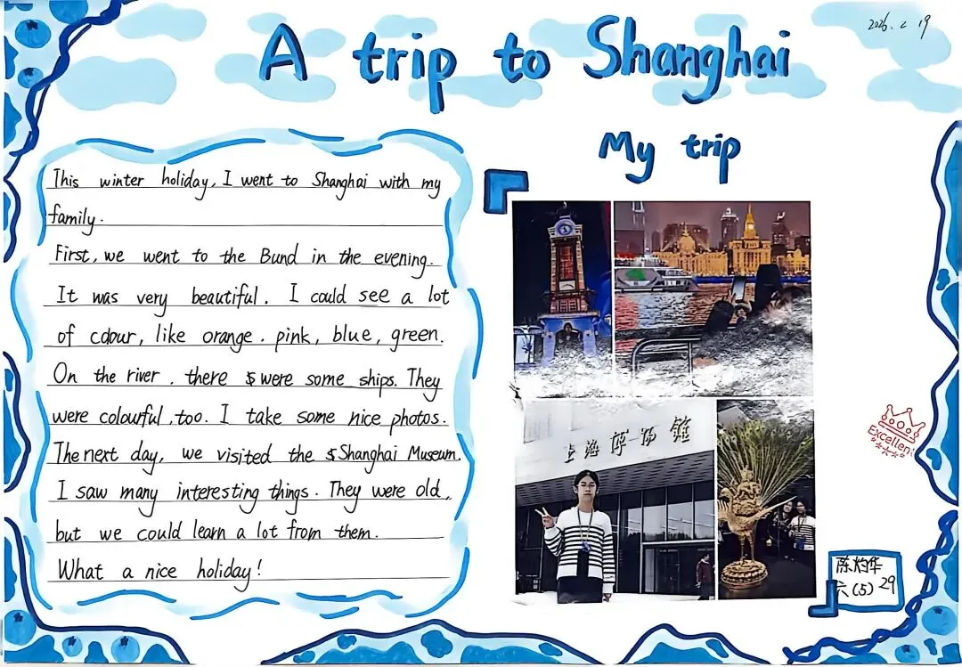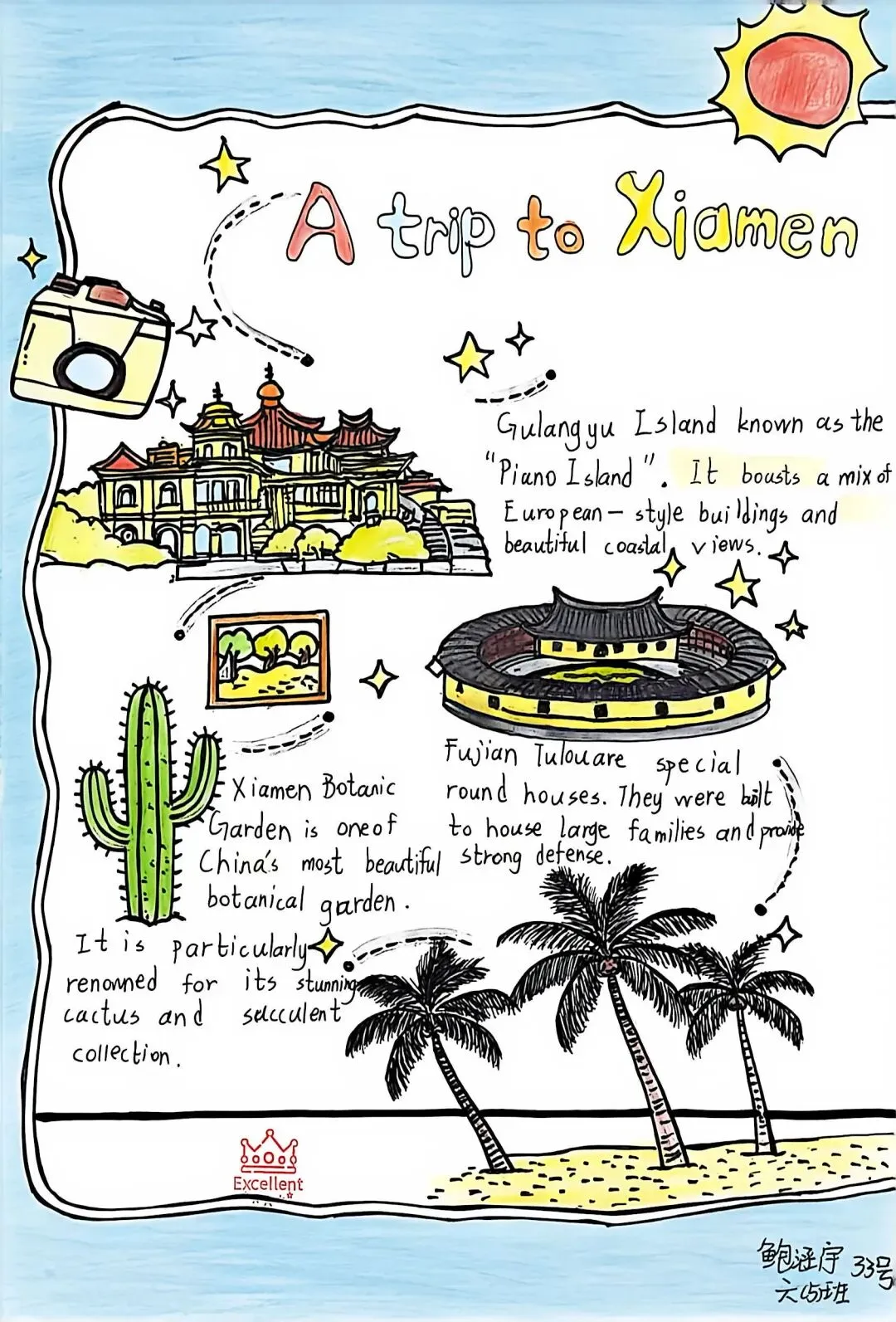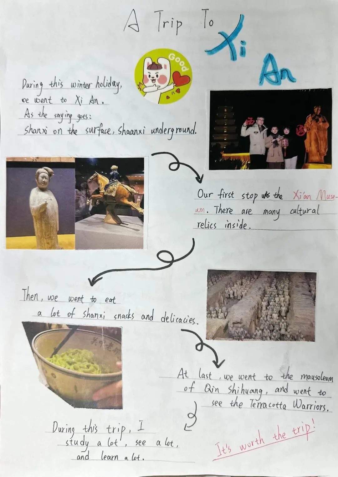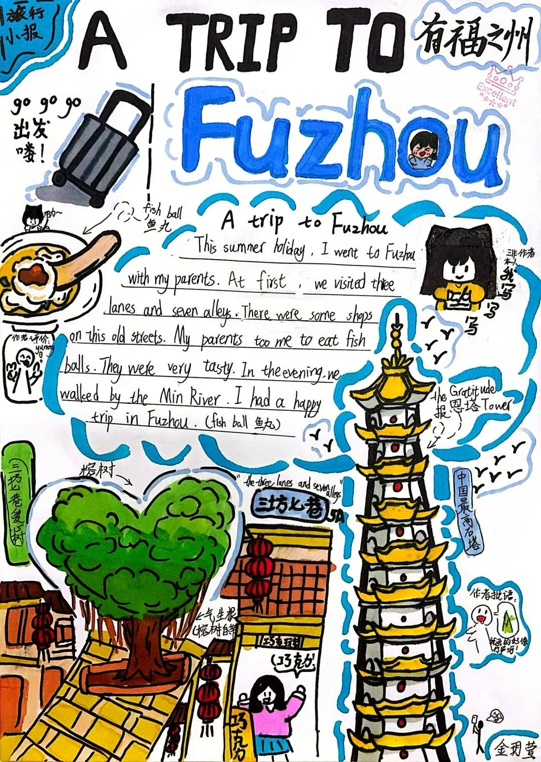 描绘A trip to...主题的作品中,大家巧用过去时,将旅行中的同行之人、趣味经历、沿途风光娓娓道来,扎实的语法运用能力藏于字里行间。