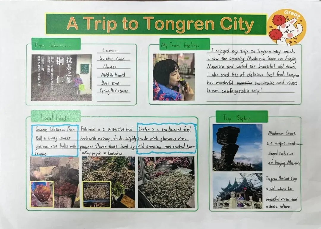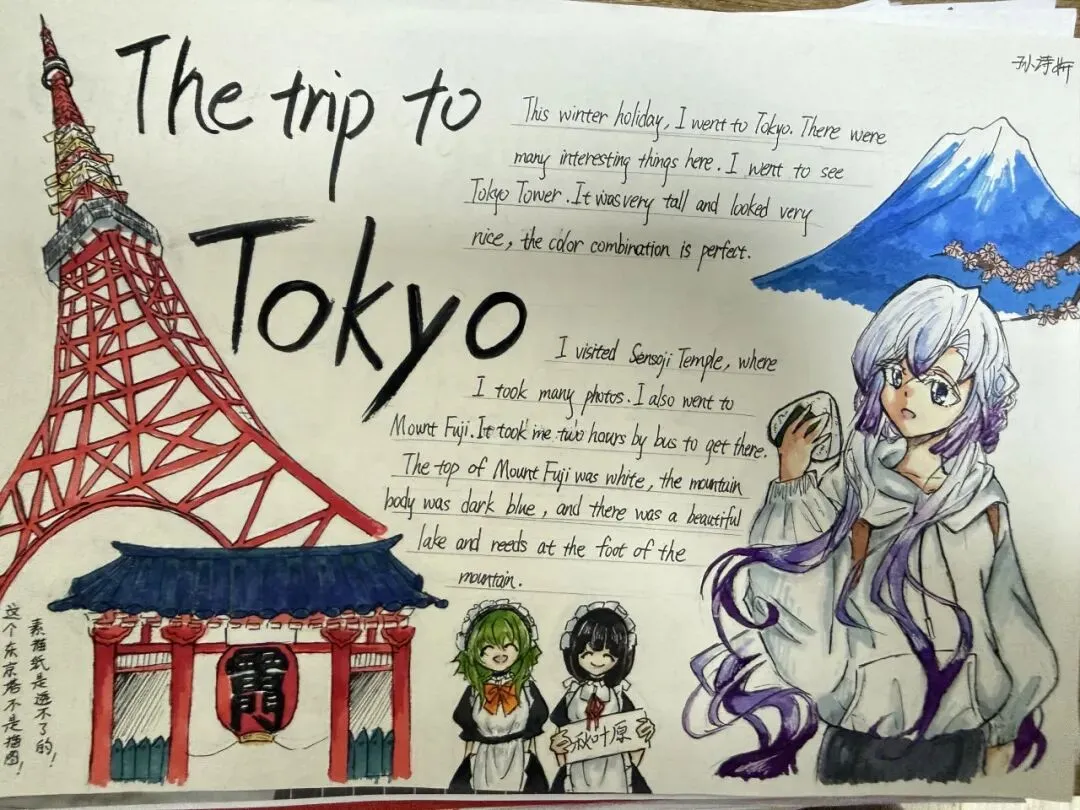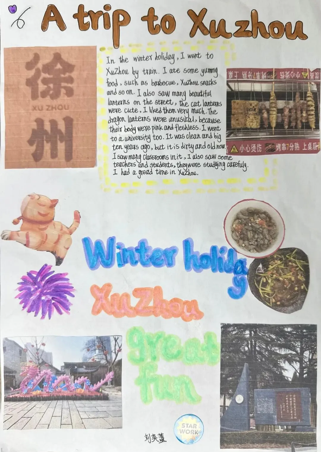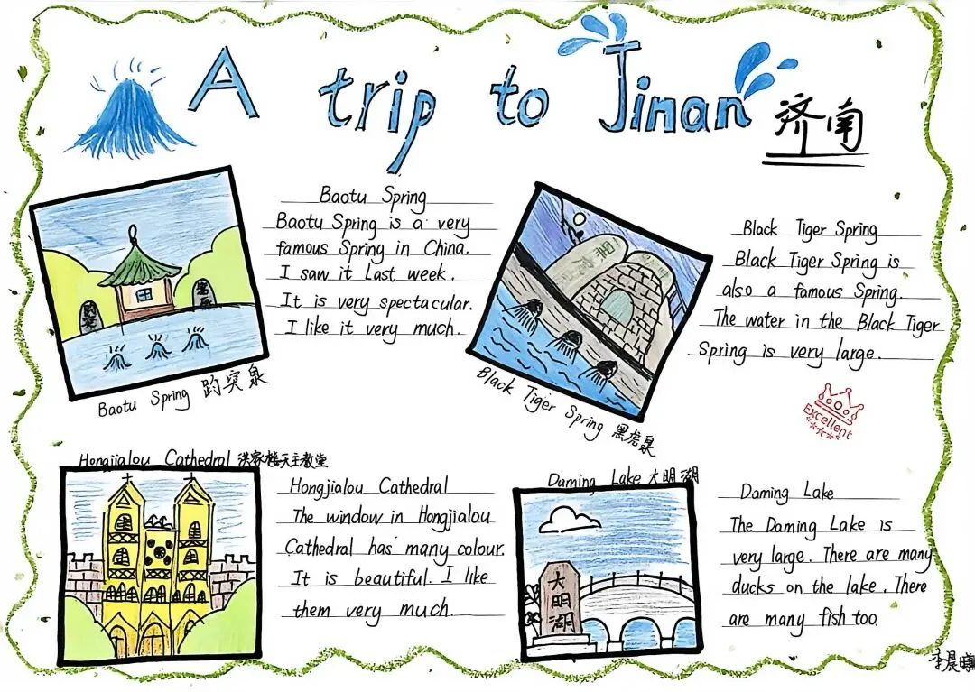 描绘A trip to...主题的作品中,大家巧用过去时,将旅行中的同行之人、趣味经历、沿途风光娓娓道来,扎实的语法运用能力藏于字里行间。