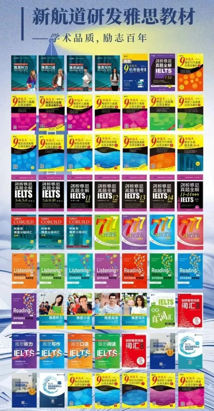 新航道自主研发教材500余种,学术品质,立志百年。胡敏雅思系列教材、雅思九分达人系列教材畅销全国200余万册,与剑桥雅思真题相辅相成,揭示雅思出题规律,破解雅思考试题型,帮助学生高效备考。