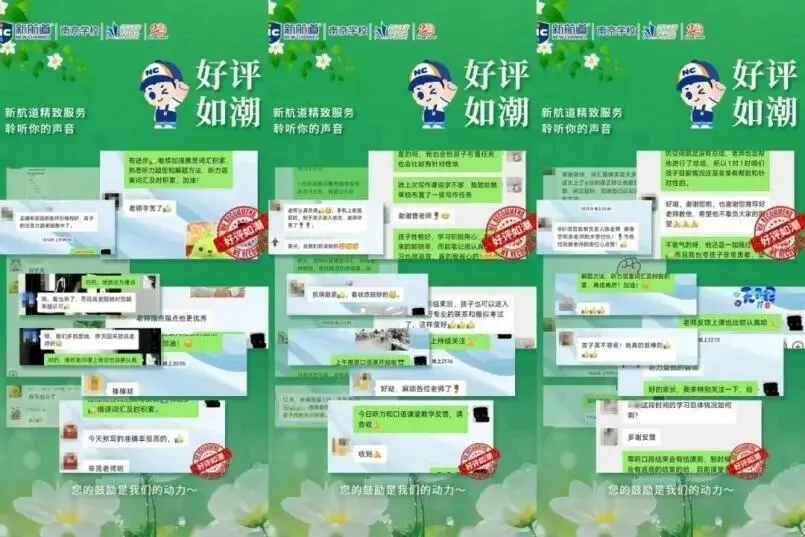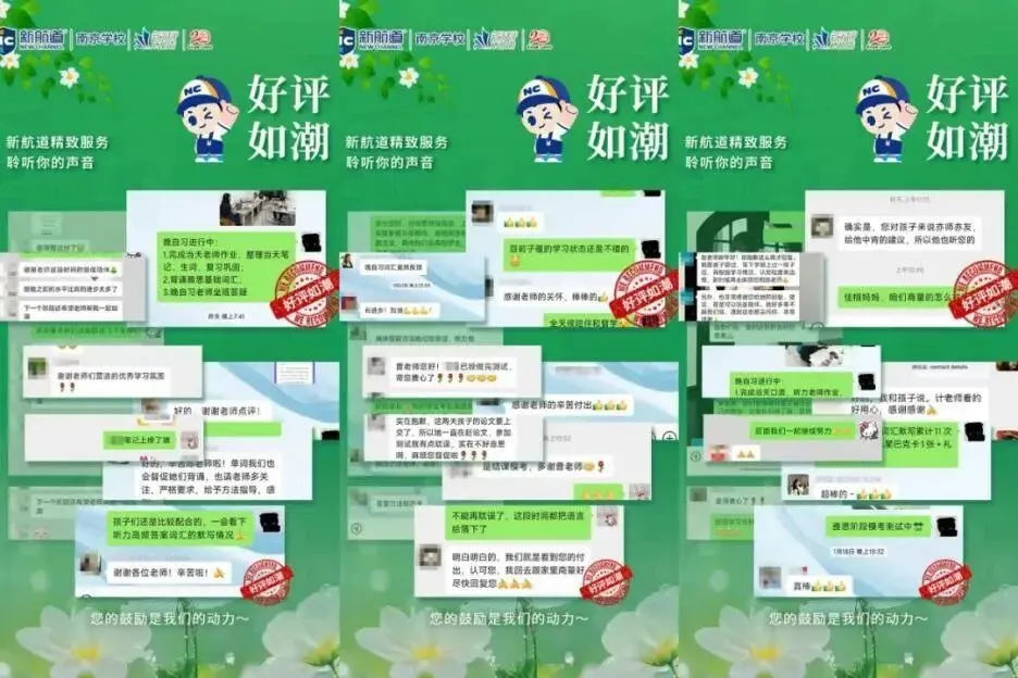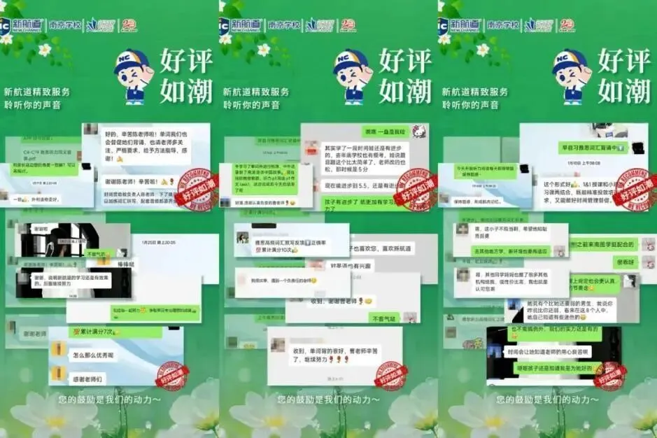 新航道南京学校100+助教老师全程跟班,早晚自习和辅导课期间,跟盯辅导,单词打卡,作业批改,每日反馈,阶段测试,结课测试,教辅测评结合,消化更好,掌握更多!于是老师们经常收到学员们的出分好评反馈,学员们的进步确实肉眼可见,选择新航道精致教学服务,学员们成绩提升有保障。